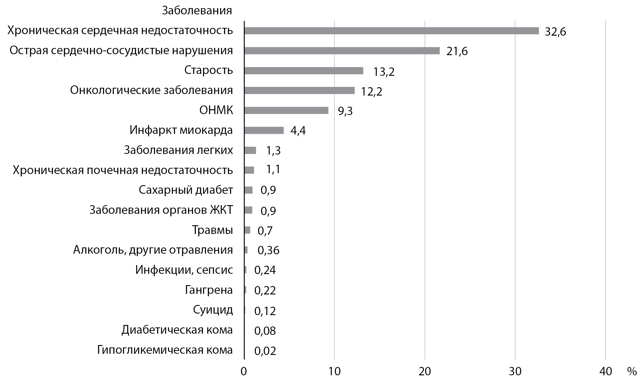 Примечания: ХСН – хроническая сердечная недостаточность; ИМ – инфаркт миокарда, ОНМК – острое нарушение мозгового кровообращения; Онко – онкологические заболевания; ХПН – хроническая почечная недостаточность; Диаб. кома – диабетическая кетоацидотическая кома; Гипогл. кома – гипогликемическая кома; ОССЗ – острые сердечно-сосудистые заболевания; прочие – прочие заболевания.