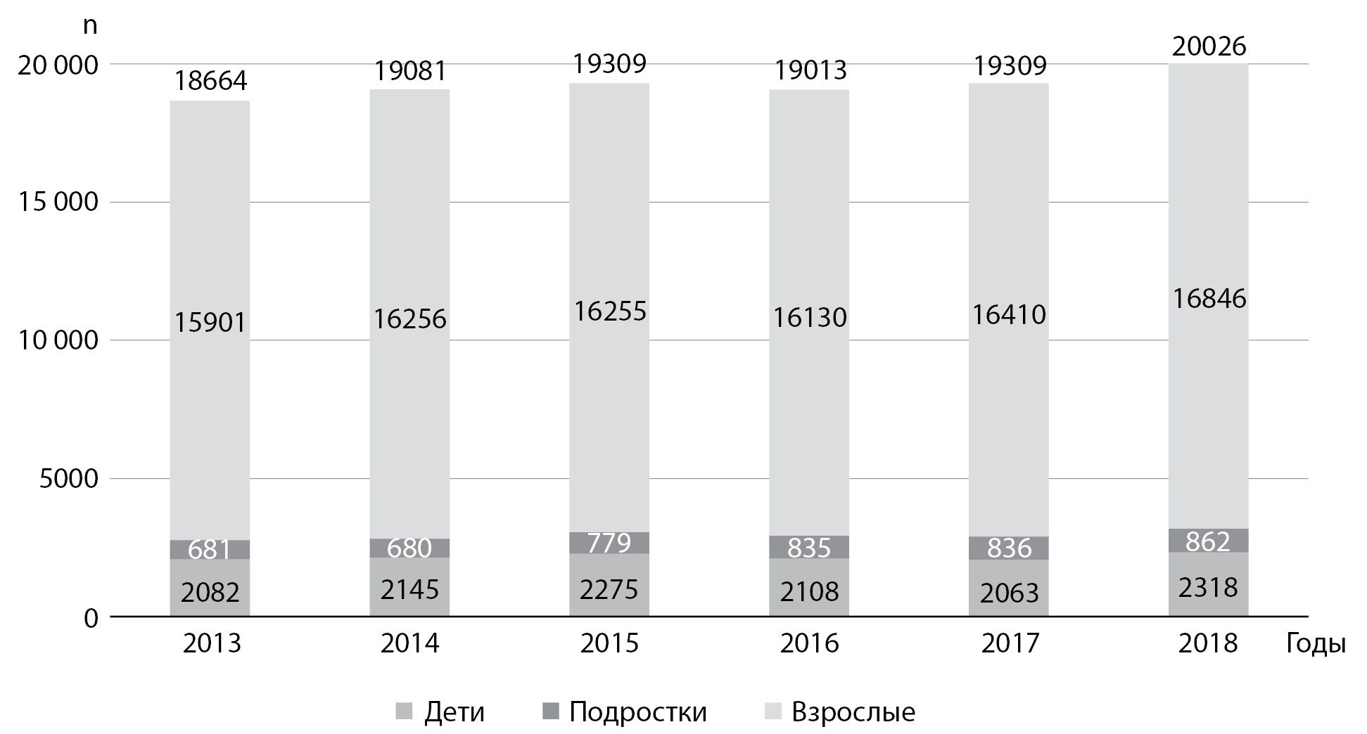 1. Fig. 1. Dynamics of the total number of patients with type 1 diabetes mellitus taking into account the age from 2013 to 2018.