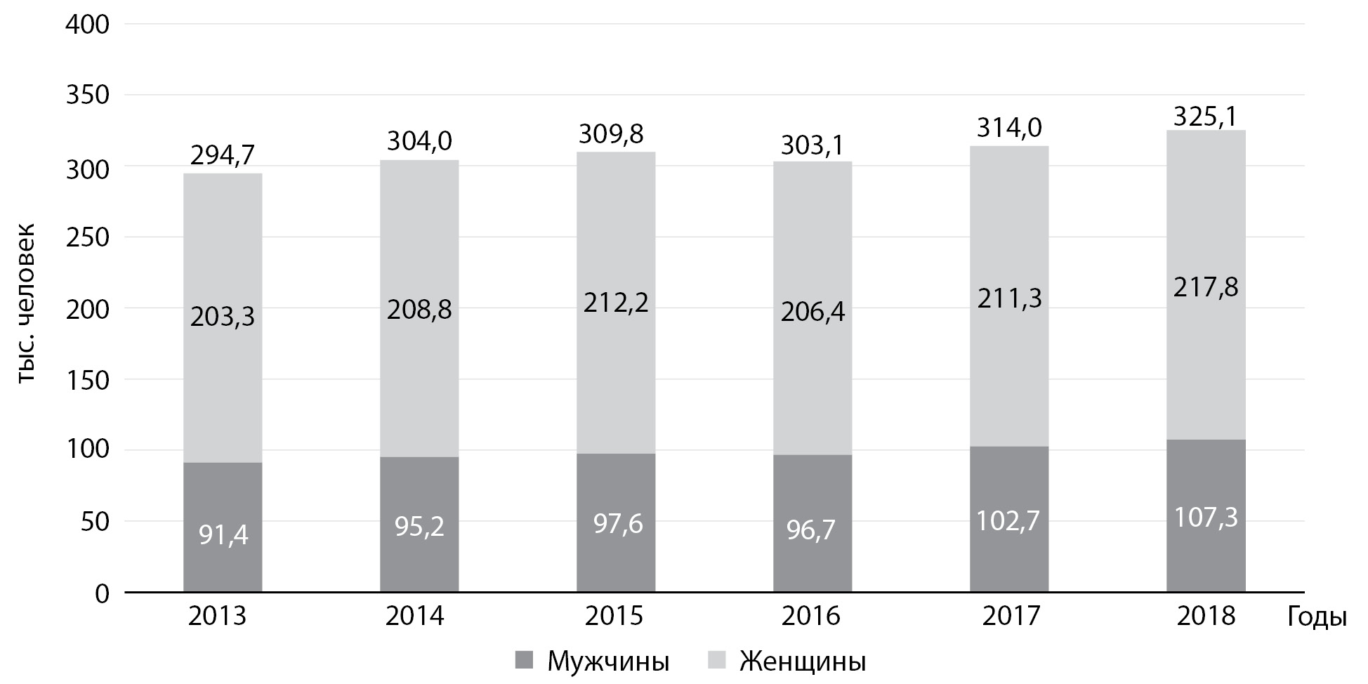 10. Fig. 10. Dynamics of the incidence of type 2 diabetes among the adult population of Moscow from 2013 to 2018, distribution by sex (per 100 thousand people).