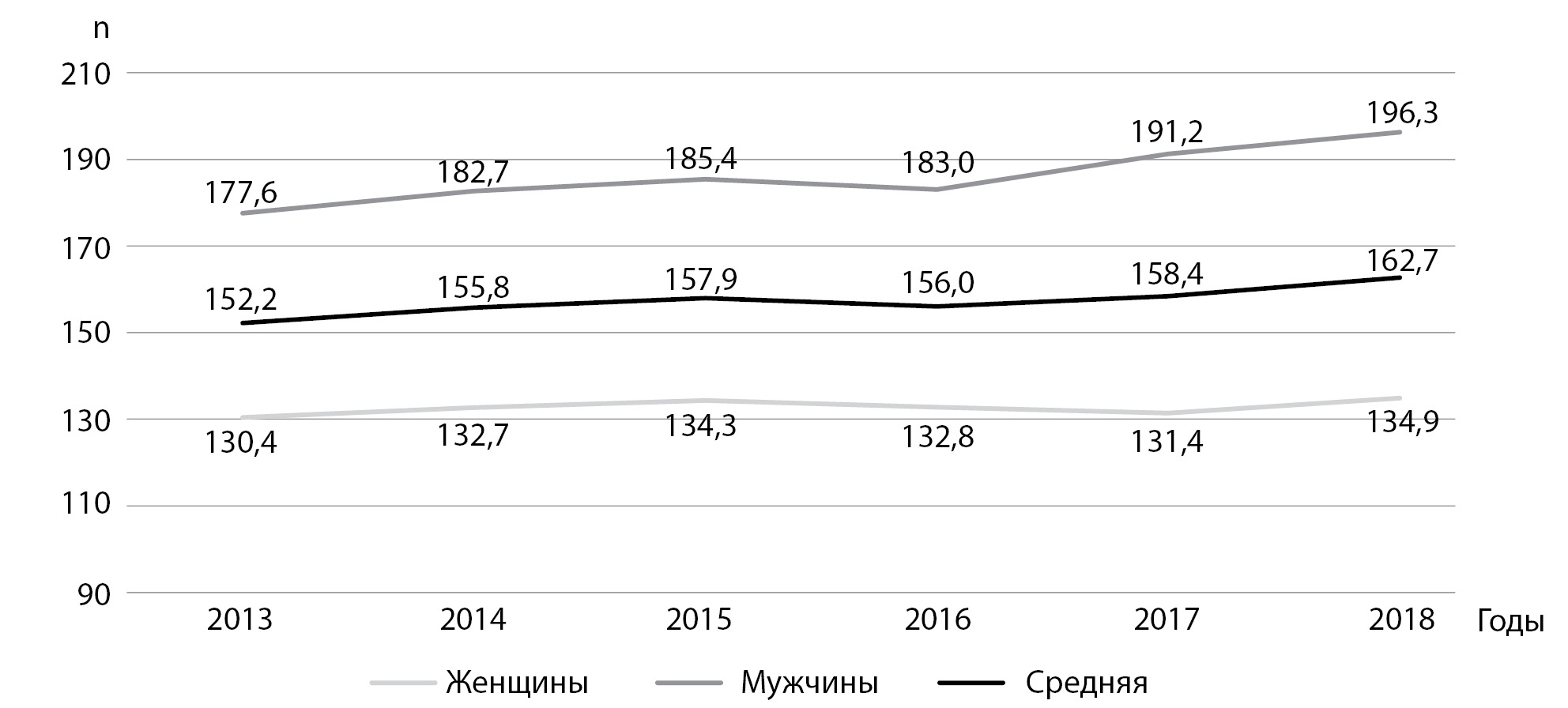 6. Fig. 6. The dynamics of the prevalence of type 2 diabetes from 2013 to 2018, distribution by gender (per 100 thousand of the population of Moscow).