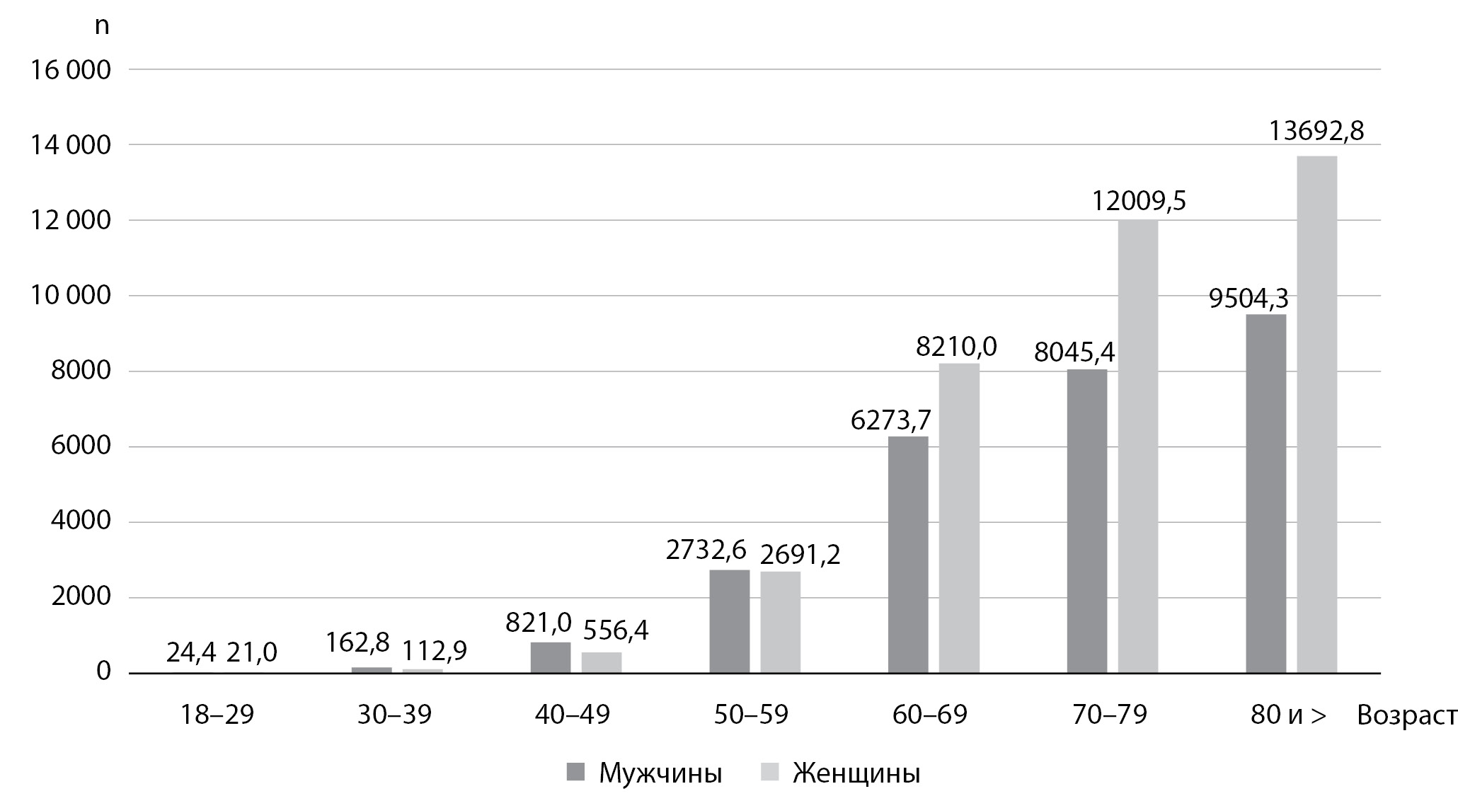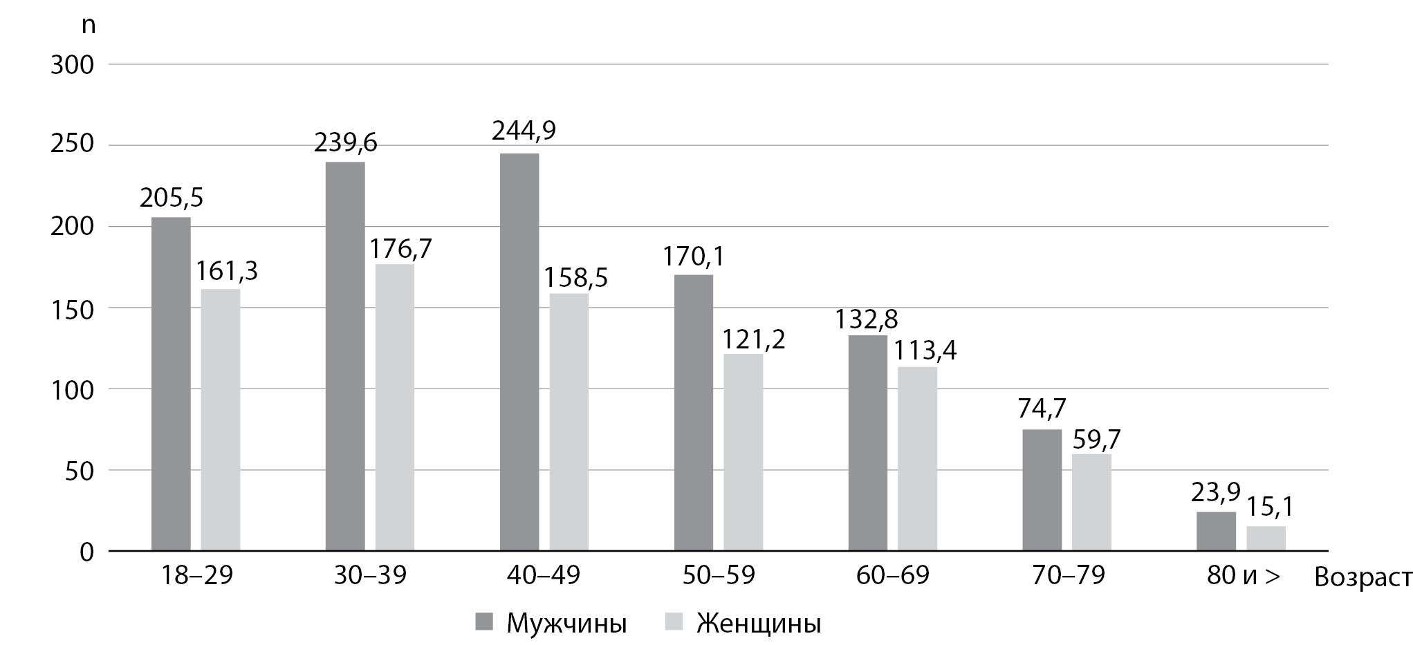 8. Fig. 8. The prevalence of type 2 diabetes in Moscow in 2018, the distribution by sex and age (per 100 thousand people).