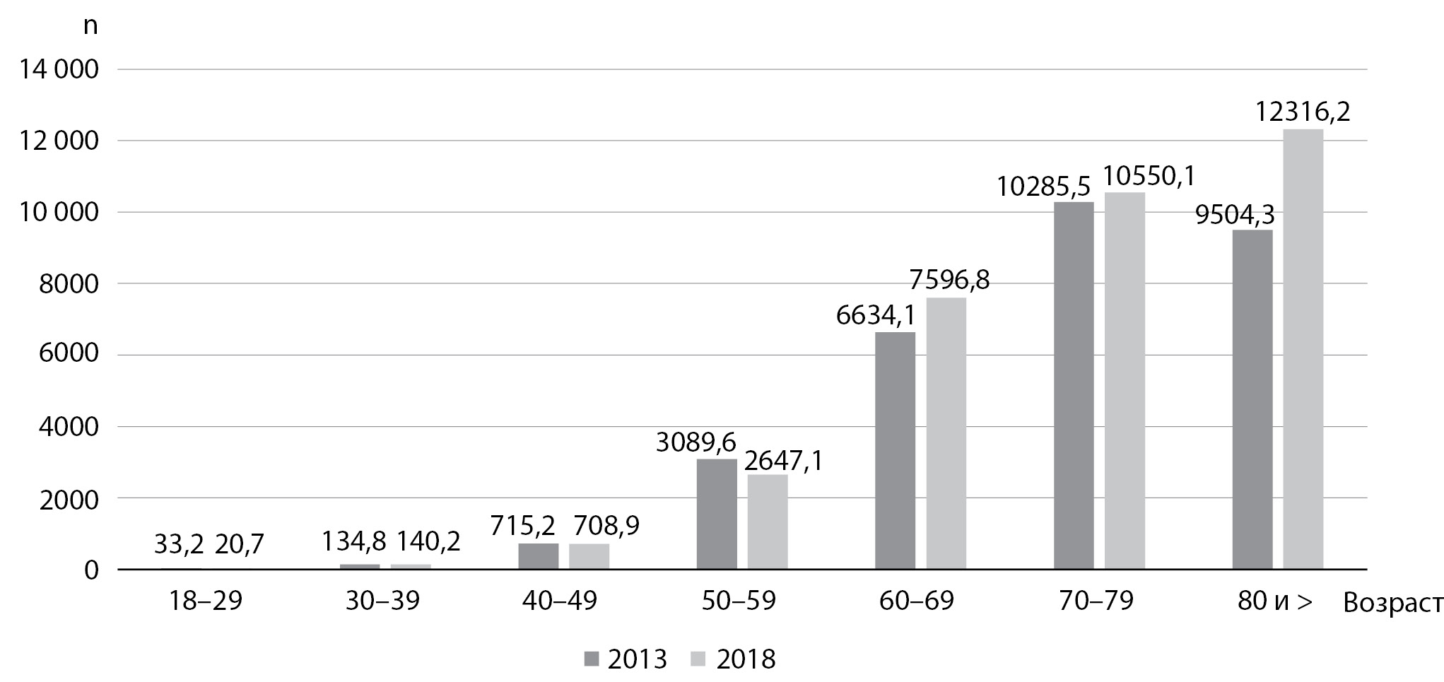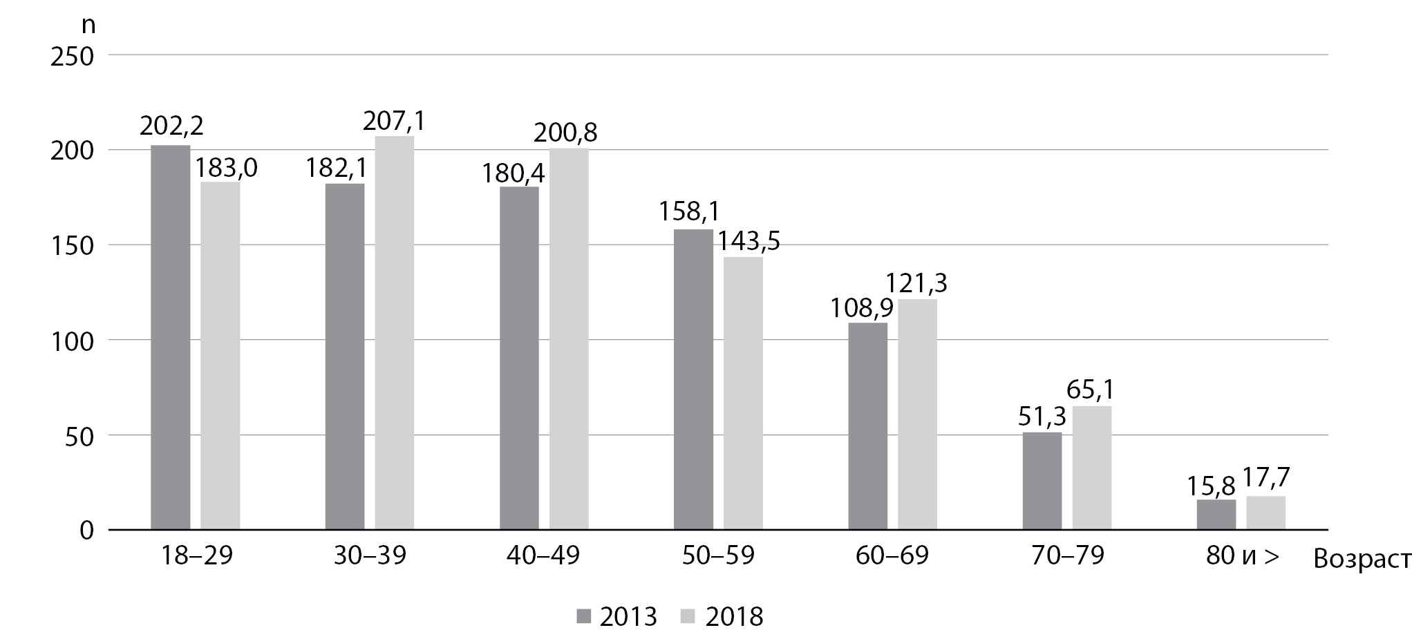 5. Fig. 5. Dynamics of the prevalence of type 1 diabetes mellitus, age distribution among adult patients per 100 thousand of the population of Moscow (comparison of indicators of 2013 and 2018).