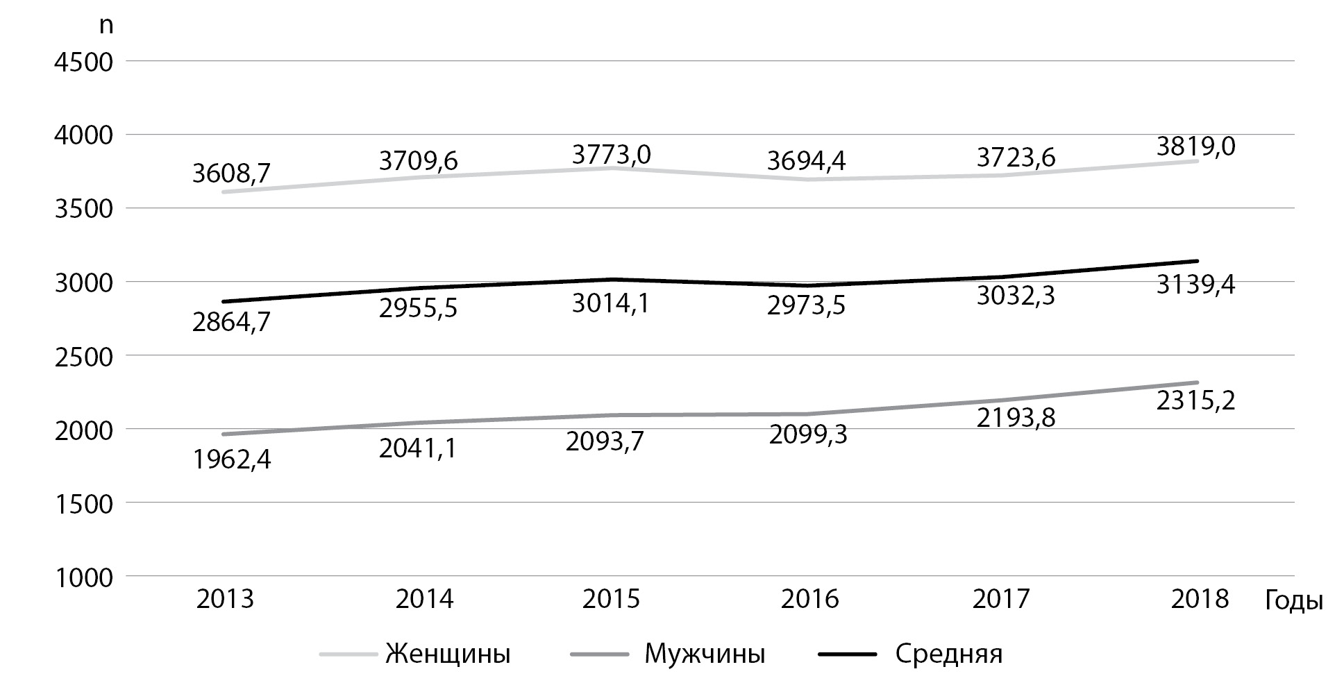 2. Fig. 2. Dynamics of the total number of patients with type 2 diabetes mellitus taking into account gender from 2013 to 2018.