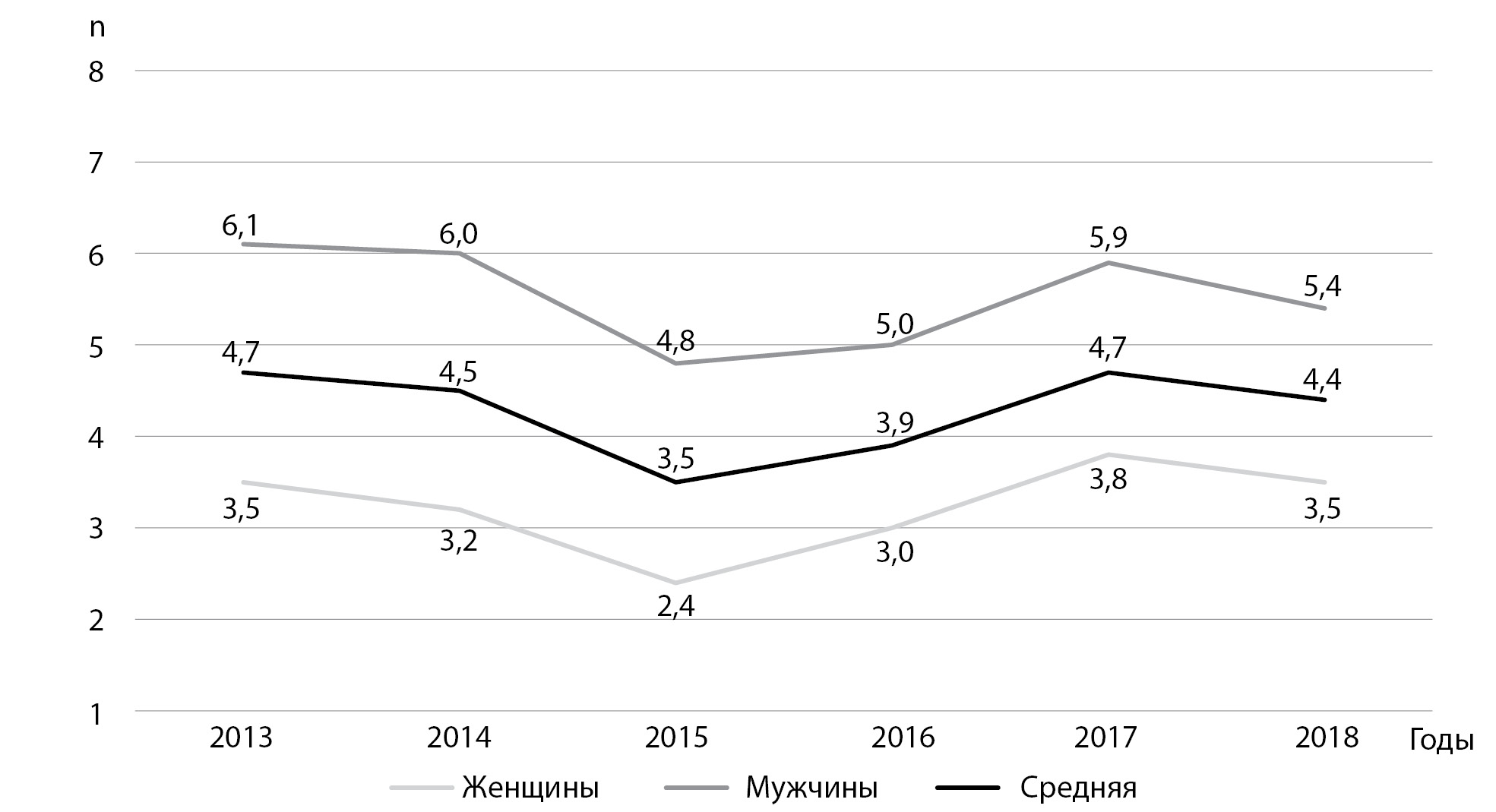 9. Fig. 9. Dynamics of the incidence of type 1 diabetes among the adult population of Moscow from 2013 to 2018, distribution by sex (per 100 thousand people).