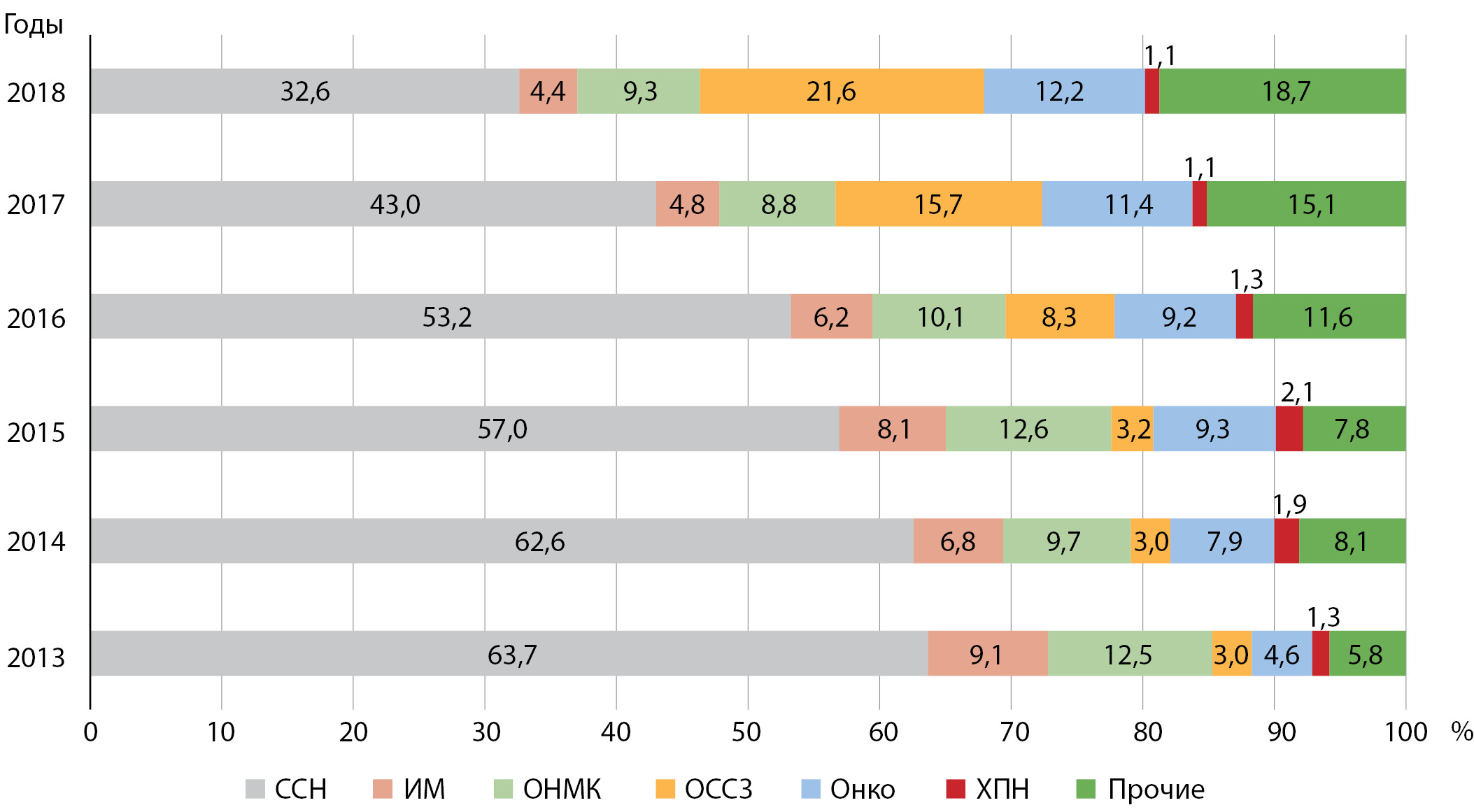 13. Fig. 13. The structure of the most common causes of death of patients with type 2 diabetes in Moscow according to the Federal Register of Diabetes from 2013 to 2018: CCH - cardiovascular failure; IM - myocardial infarction; ONMK - acute cerebrovascular accident; Onco - oncological diseases; CRF - chronic renal failure; OSSZ - acute cardiovascular diseases; others - other diseases.