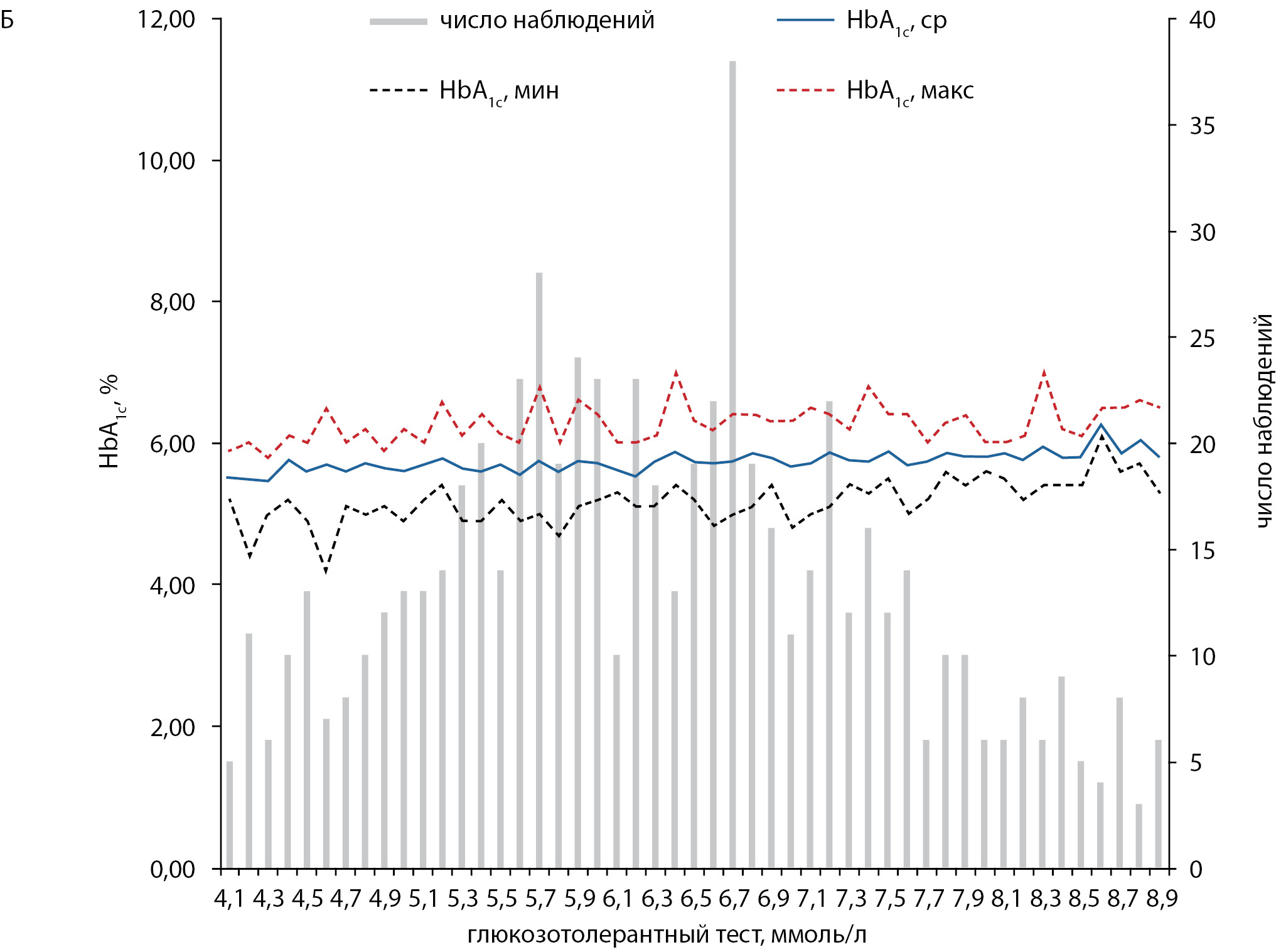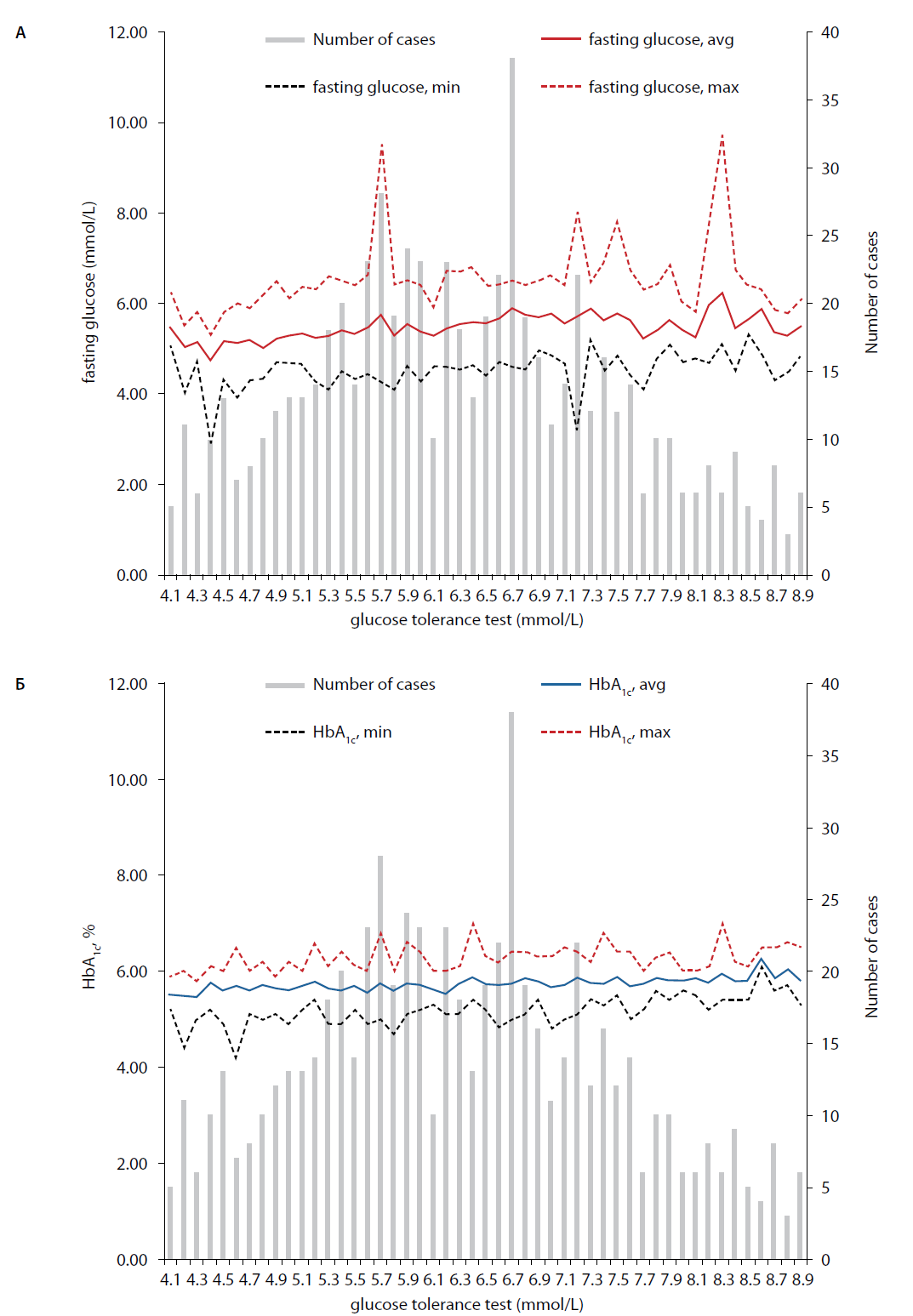 2. Рис. 1. Разброс значений глюкозы натощак (А) и гликированного гемоглобина (Б) при одинаковых уровнях глюкозной нагрузки. | |