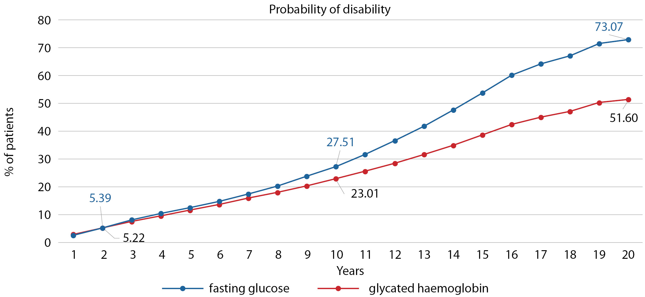 На рис. 2 представлена динамика вероятности развития инвалидности, которая представляет собой сумму вероятностей развития вышеуказанных осложнений СД (иными словами, на графике отражена вероятность наступления любого или нескольких осложнений, приводящих к инвалидизации), изображенная нарастающим итогом отдельно для двух сравниваемых тестов. Как видно из данных, представленных на рис. 2, прирост вероятности наступления инвалидности при применении для диагностики СД2 теста ГНТ выше, чем при использовании HbA1c, что объясняется меньшей чувствительностью этого теста для ранней диагностики СД2 и большим числом пациентов с недиагностированным диабетом.
