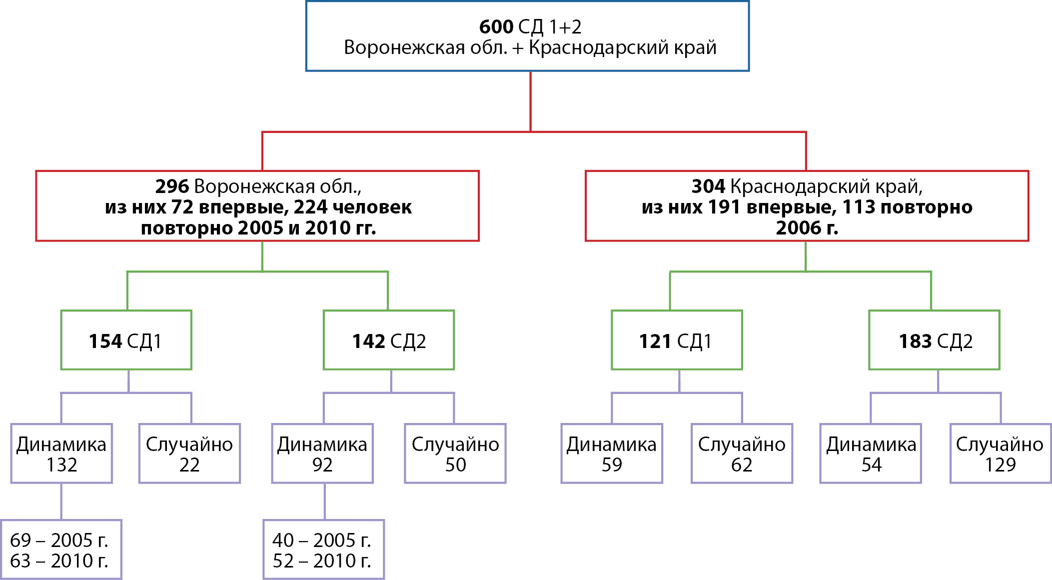 В Диамодуле обследовано 600 взрослых пациентов с СД 1 типа (СД 1) и СД 2 типа (СД 2), из них бóльшую часть, так называемую «динамическую выборку», составили пациенты, которых удалось вызвать для повторного обследования через 13–14 лет – в Воронежской области n=224, в Краснодарском крае n=113. Оставшаяся часть пациентов до достижения n=300 в каждом регионе представлена «случайной выборкой» из баз данных региональных сегментов регистра СД (в Воронежской области n=72, в Краснодарском крае n=191), (рис. 1). Все пациенты подписали добровольное информированное согласие на участие в обследовании в Диамодуле.