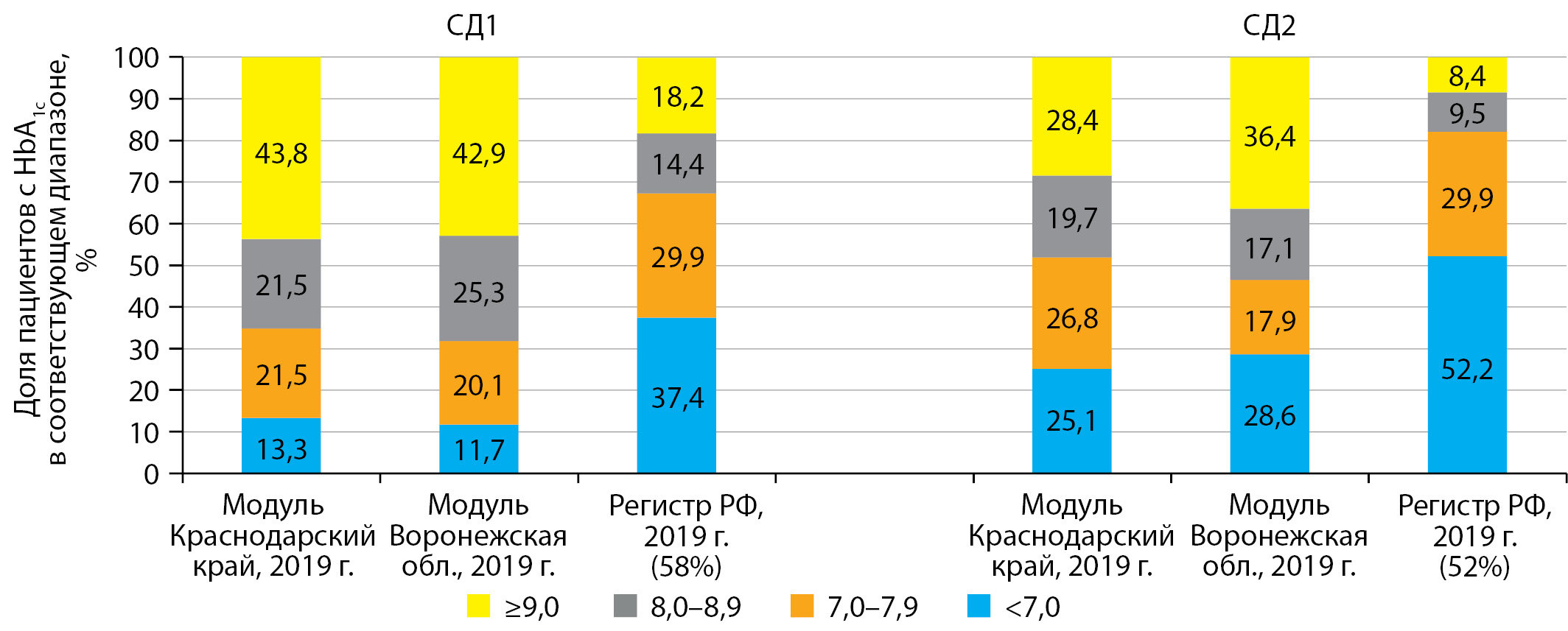 МЕТОДЫ. Объект исследования: пациенты с СД 1 типа (СД 1) и СД 2 типа (СД 2), обследованные в Диамодуле в 2019 г. в Воронежской области (ВО) и Краснодарском крае (КК) (n=600), из них «динамическая выборка» повторно обследованных (ВО n=224; КК n=113), «случайная выборка» новых пациентов (ВО n=72; КК n=191); выборка взрослых пациентов из ФРСД с указанными показателями HbA1c в 2019 г. (n=2 410 067).
