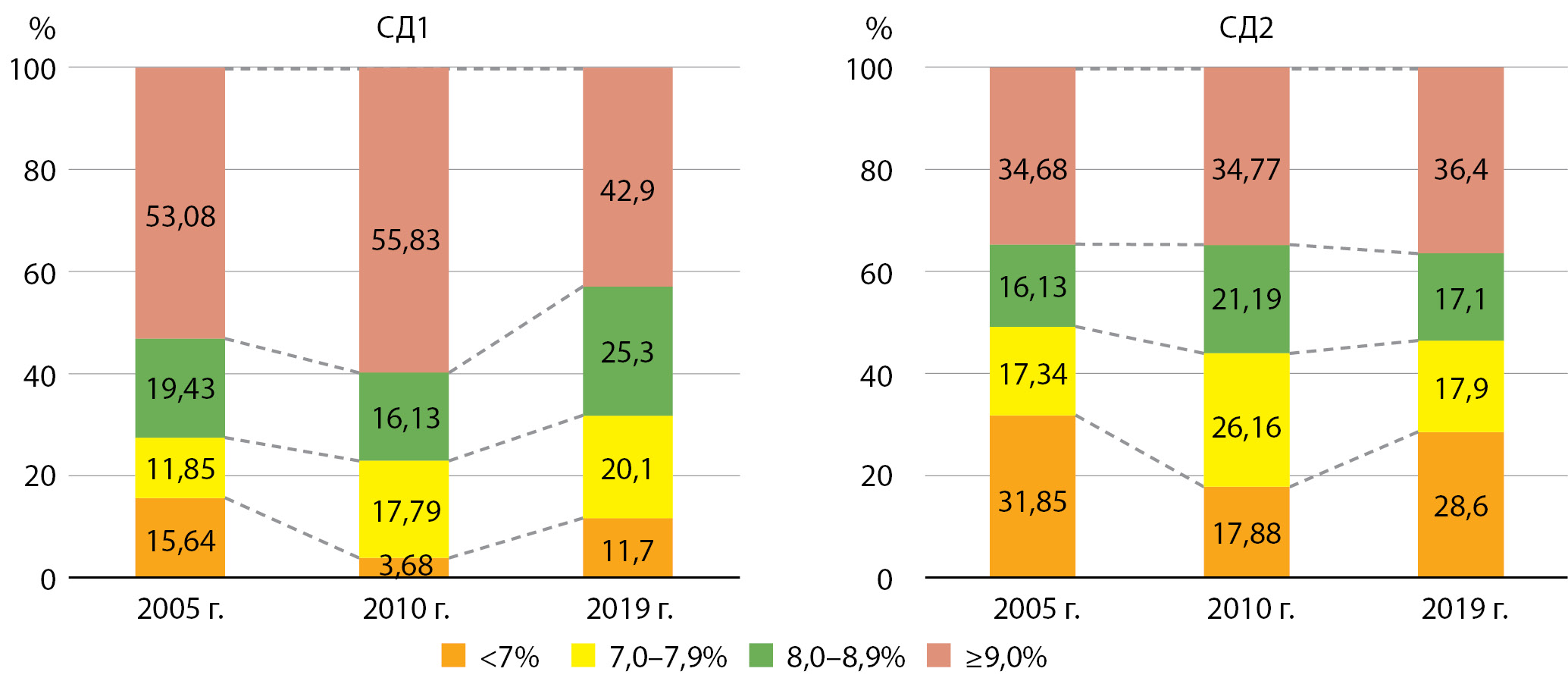 Следует отметить, что в различных регионах мира доля пациентов, которые достигают целевых значений HbА1c, остается невысокой и во многом зависит от типа СД, источника данных и применяемой методики сплошной или выборочной оценки HbA1c в обследуемой когорте. Так, по данным регистра Англии в период 2015–2016 гг. доля пациентов с HbA1c<7,5% составила 30% при СД1 и 66% при СД2 при охвате исследованием 83% с СД1 и 95% пациентов с СД2 [10]. По данным анализа электронной базы медицинских учреждений США, включившего 1742 взрослых с диагнозом СД (без указания типа), у которых были внесены показатели HbA1c – целевому уровню соответствовали 64% пациентов [11]. В исследовании в Московской области, где были выборочно обследованы с определением уровня HbA1c 1476 больных СД1 и СД2 из 24 муниципальных образований, HbA1c <7% выявлен у 28,04% пациентов, средний уровень HbA1c составил 8,6%, различий в среднем уровне HbA1c между пациентами с СД1 и СД2 не установлено [12].