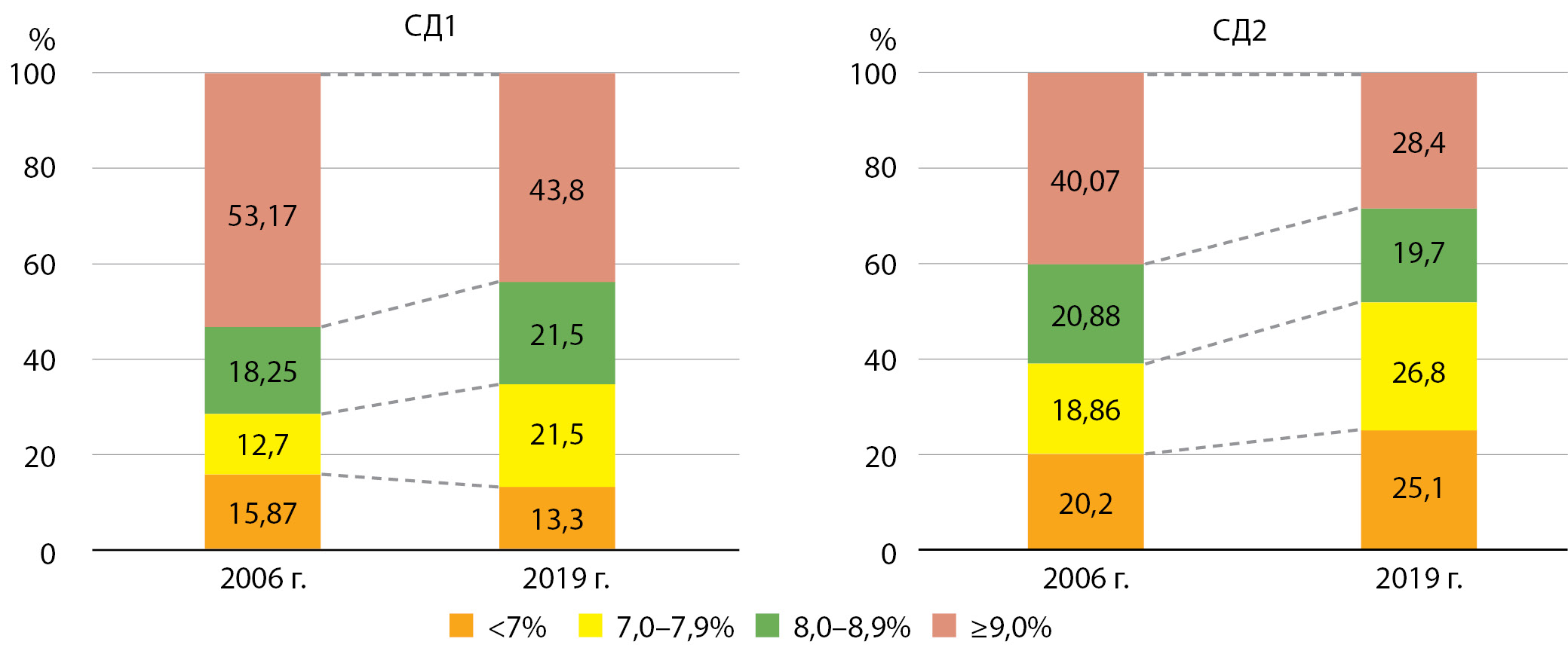 4. Рис. 4. Динамика распределения пациентов по уровню гликированного гемоглобина в Краснодарском крае по данным выездов мобильного медицинского центра в 2006 г. и в 2019 г. СД1 – сахарный диабет 1 типа; СД2 – сахарный диабет 2 типа.