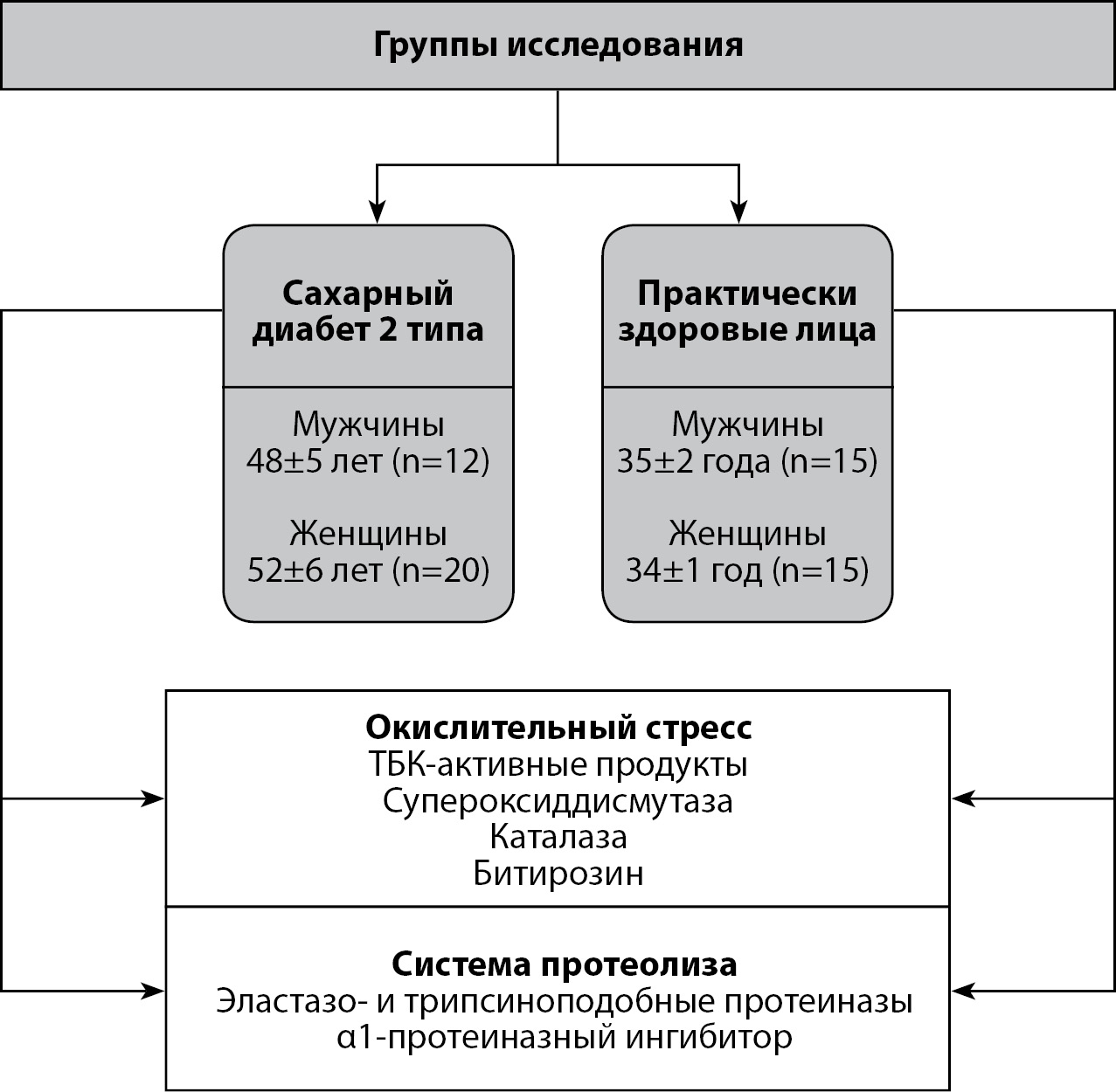 Материалы и методы. Проведено обсервационное одноцентровое одномоментное выборочное исследование с участием пациентов с сахарным диабетом 2 типа и контрольной группы (практически здоровые лица). У всех обследуемых в плазме крови спектрофотометрическим методом определялись активность эластазо-, трипсиноподобных протеиназ, α1-протеиназного ингибитора, содержание битирозина как показателя окислительной модификации белков и состояние перекисного окисления липидов (ПОЛ): концентрация ТБК-активных продуктов и активность антиоксидантных ферментов — супероксиддисмутазы, каталазы.
