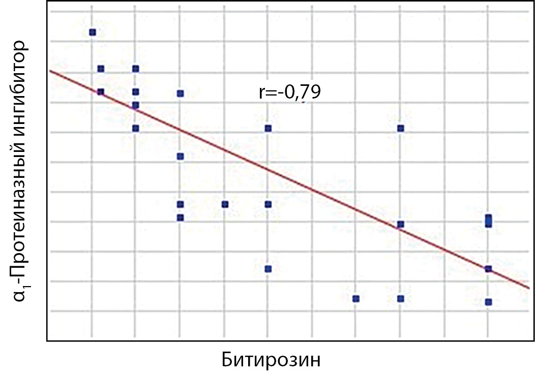 В результате активации окислительного стресса происходят накопление его продуктов (ТБК-активные продукты) и продуктов окислительной модификации белков (битирозин), активация антиоксидантных ферментов (каталаза, СОД) по механизму автономной регуляции, а именно регуляция активности фермента уровнем субстрата или продуктом реакции [15]. Под действием активных форм кислорода происходит повреждение активного центра α1-ПИ, данный механизм подтверждается увеличением уровня окисленных модифицированных белков (битирозина). Обоснованием этого является наличие обратной зависимости активности α1-ПИ от содержания битирозина — продукта окислительной модификации белков. Дефицит α1-ПИ приводит к более выраженной активации протеолиза при СД. Коэффициент корреляции между эластазо- и трипсиноподобными протеиназами и α1-ПИ показывает значительно высокую отрицательную связь, это свидетельствует о нарушении контроля протеолиза. Дефицит α1-ПИ в плазме крови больных СД2 может сопровождаться более тяжелым течением заболевания с поражением большего количества β-клеток поджелудочной железы чрезмерной активацией протеолитических ферментов [7–9][17].