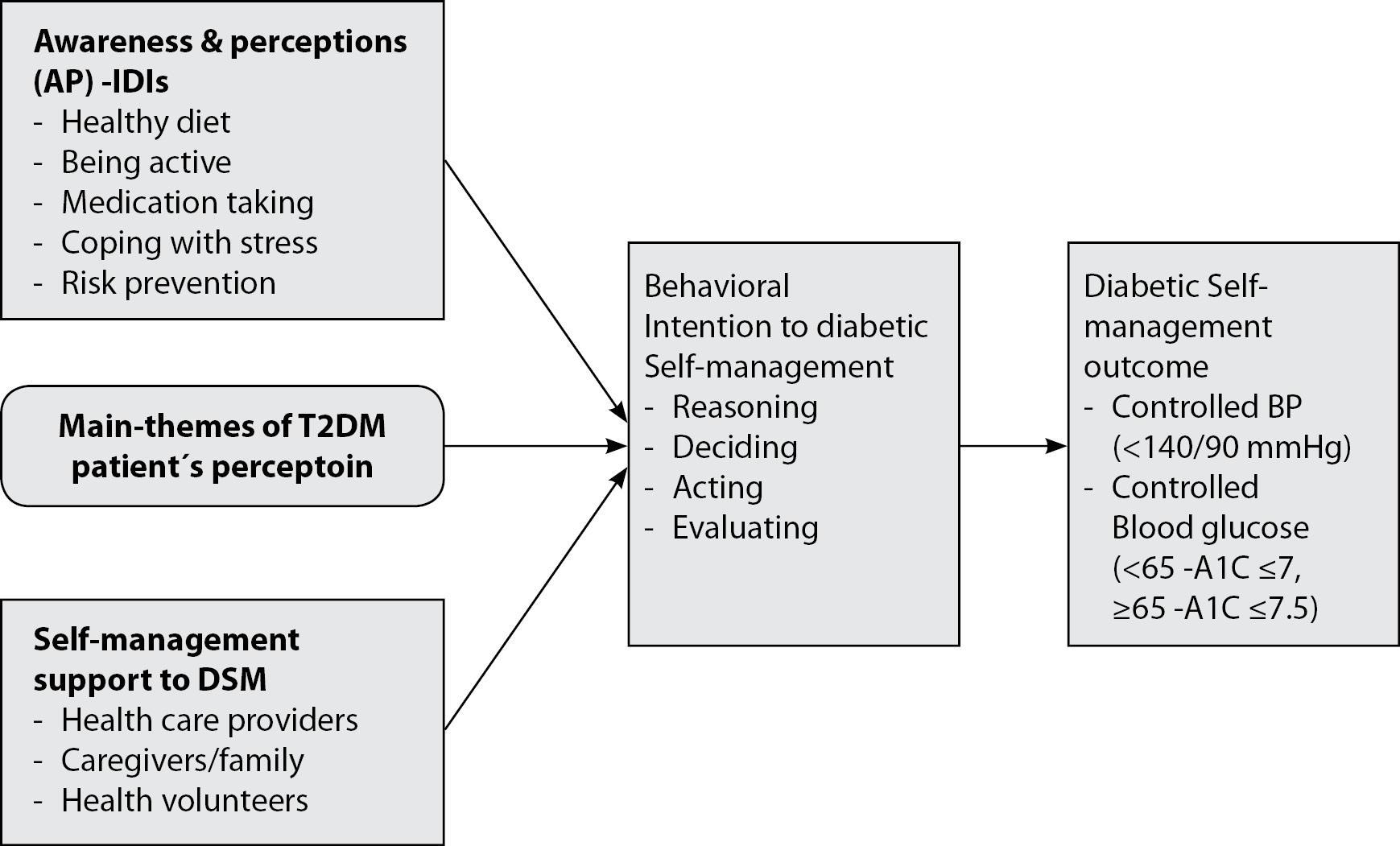 RESULTS: From this study, 60% of the participants were among the uncontrolled glycemic group while 40% were the controlled group. The controlled group was found to have better self-management in the five themes of a healthy diet, regular exercise, medication taking, and risk prevention than the uncontrolled group. T2DM elderly in a controlled group has self-awareness and diabetic management intention higher than the uncontrolled group. The patient’s attitudes revealed five themes described fours themes of diabetic self-management intentions as reasoning, deciding, acting, and evaluating to perform self-management of older T2DM patients.