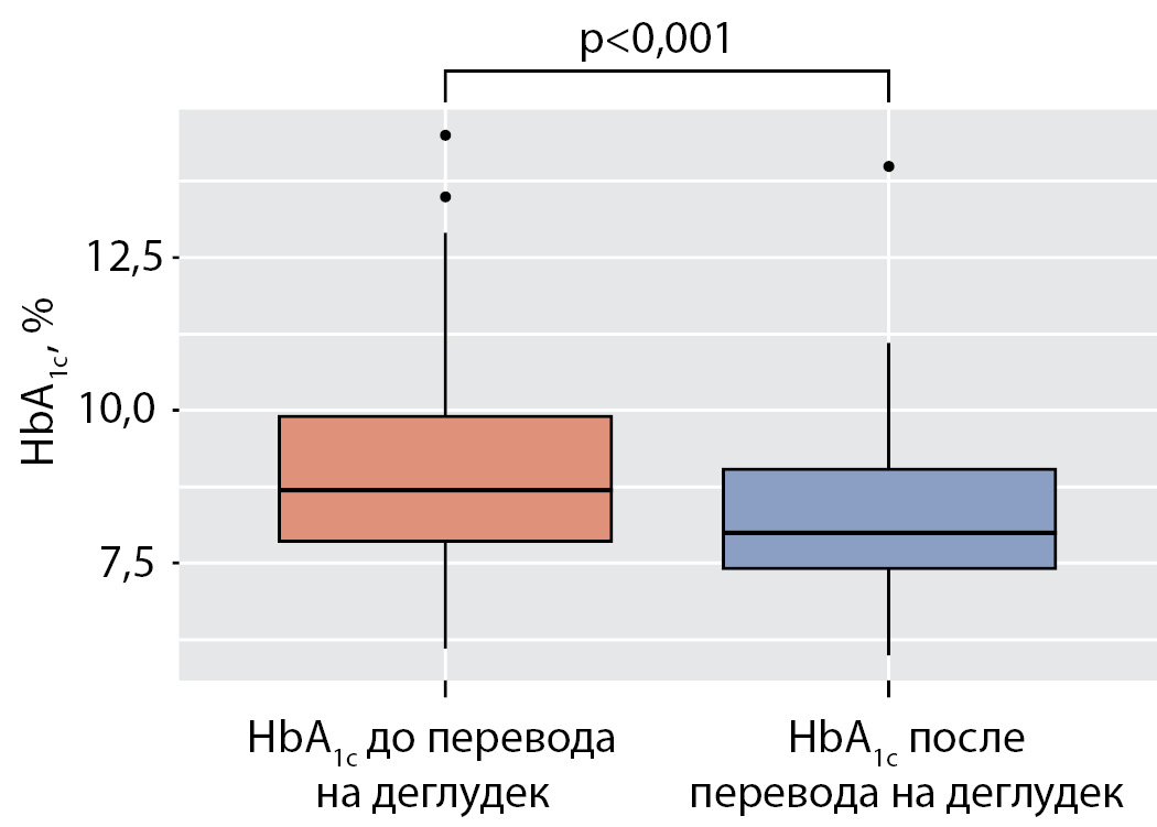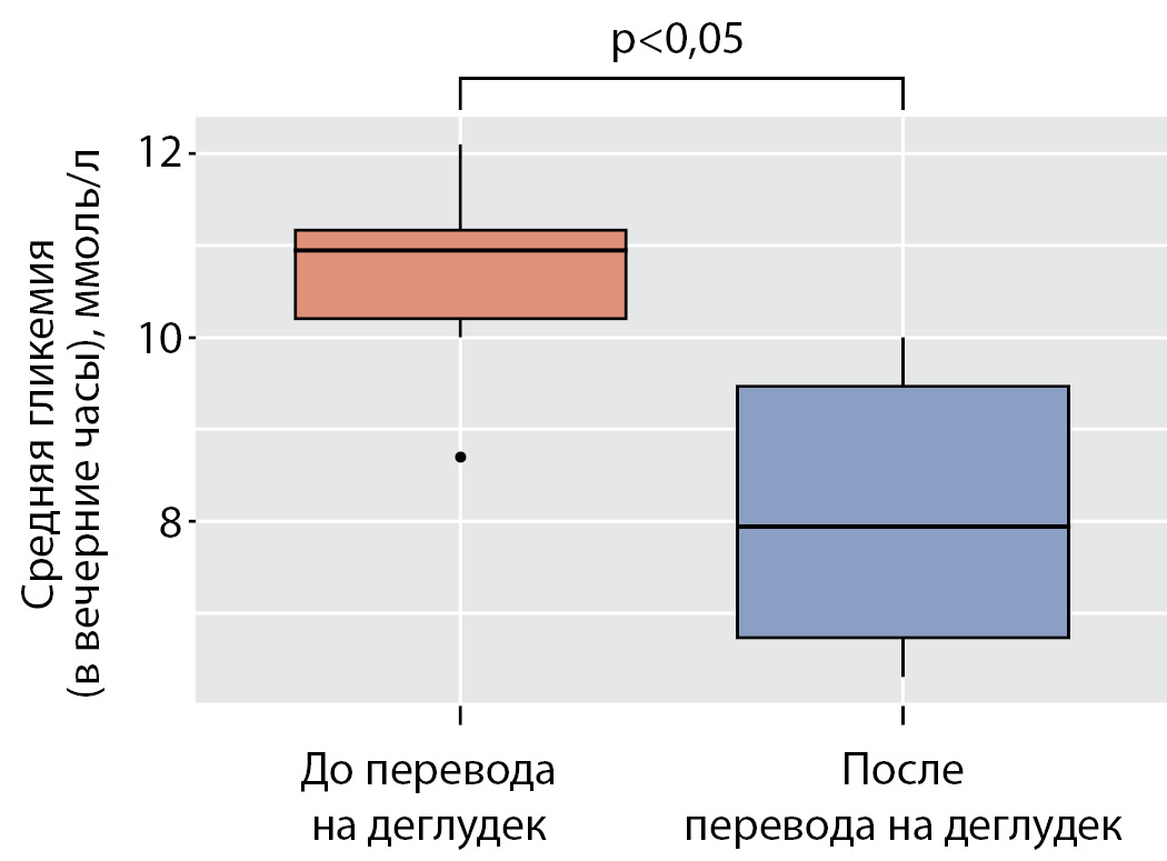 Согласно литературным источникам, перевод на инсулинотерапию с применением деглудека улучшает гликемический контроль и снижает риск гипогликемий у взрослых независимо от использовавшегося до этого аналога инсулина пролонгированного действия [32]. В нашем исследовании также не выявлено связи улучшения гликемического контроля с предшествовавшим инсулином.