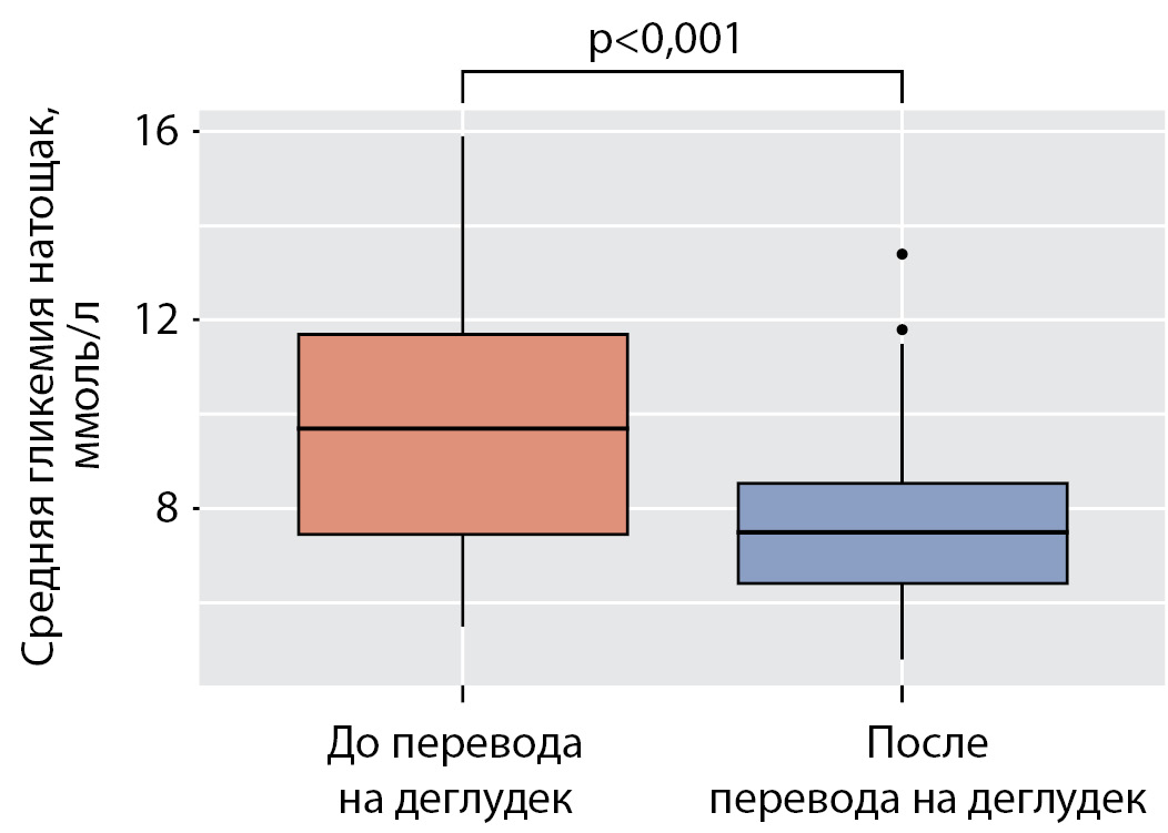 В подгруппах пациентов, переведенных на деглудек, сравнивались до и после перевода на деглудек показатели HbA1c, коэффициенты вариации гликемии (по данным 9-точечных гликемических профилей за 5–10 дней), суточная доза инсулина, показатели средней гликемии натощак и перед сном.