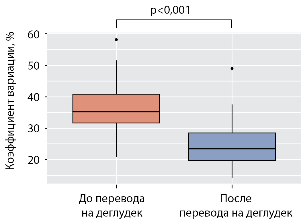 Первоначально средний показатель вариабельности был пограничным (нестабильной считается гликемия при коэффициенте вариации 36% и выше) [28]. После перевода на деглудек отмечено значительное уменьшение вариабельности гликемии.
