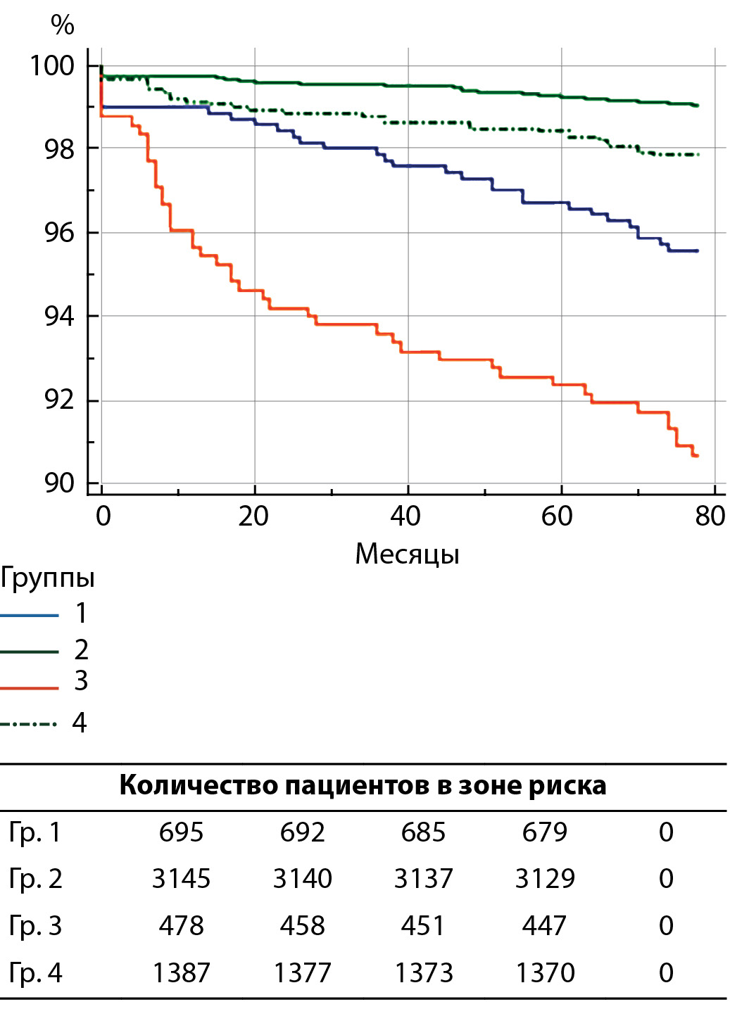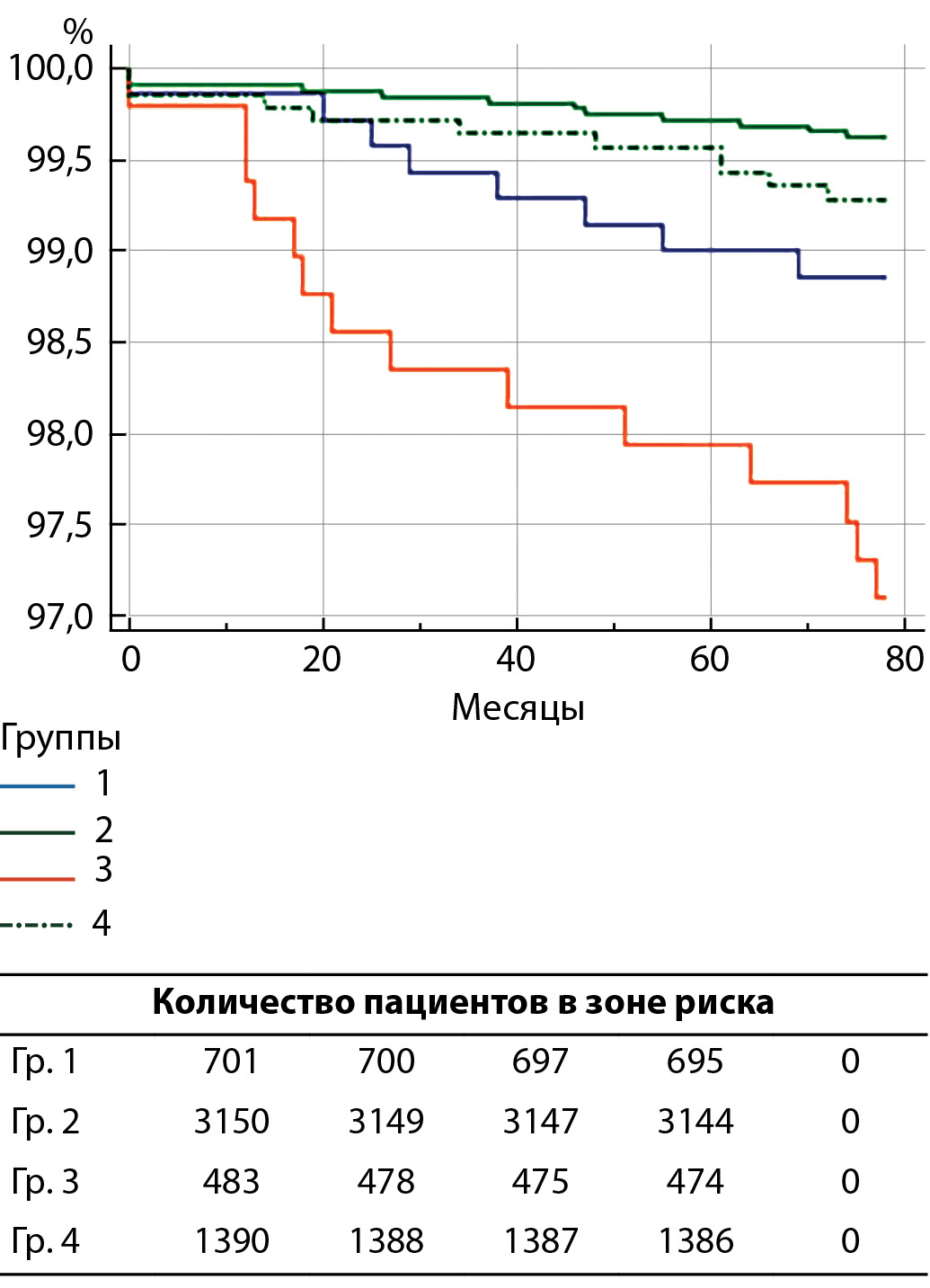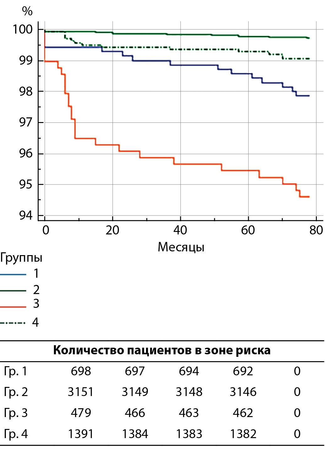 4. Рисунок 4. Выживаемость, свободная от комбинированной конечной точки (р<0,0001).