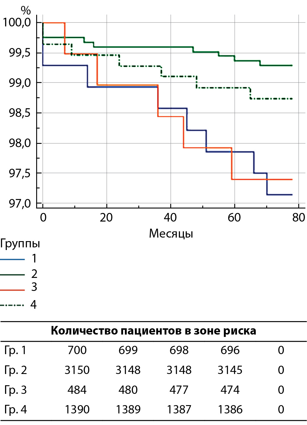 В госпитальном послеоперационном периоде пациенты были несопоставимы по показателю ОНМК/ТИА. Наибольшее количество ишемических инсультов было зафиксировано в группах эверсионной и классической КЭЭ среди больных с СД2. Такая тенденция привела к максимальным значениям комбинированной конечной точки в этих когортах (табл. 3).