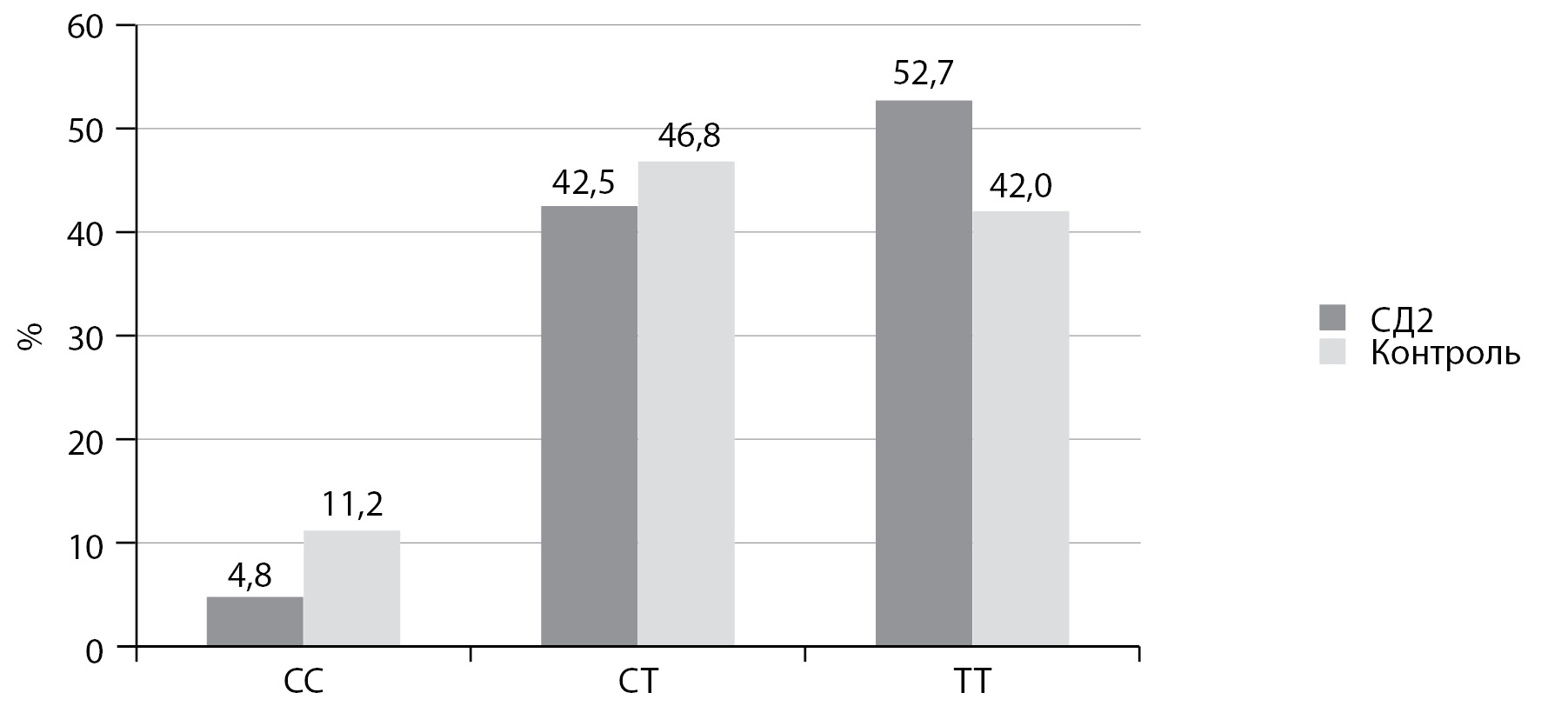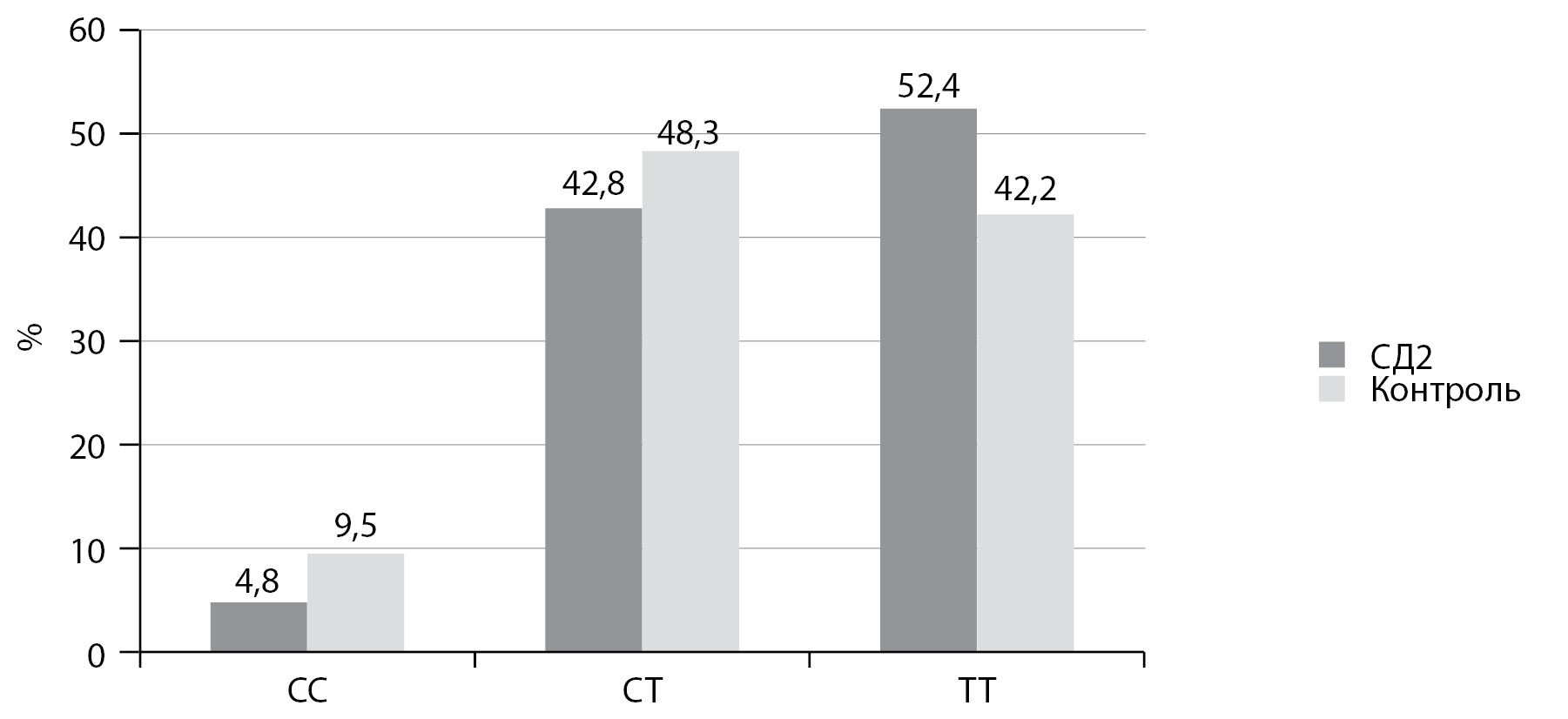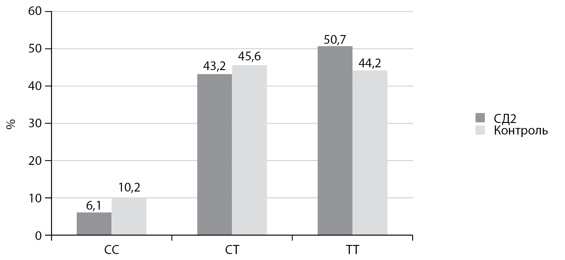 МАТЕРИАЛЫ И МЕТОДЫ. На основе проспективного наблюдения репрезентативной популяционной выборки жителей Новосибирска (The HAPIEE Project) сформированы 2 группы по принципу «случай–контроль» (случай — лица, у которых за 10 лет наблюдения выявлен СД2, и контроль — лица, у которых за 10-летний период не развились нарушения углеводного обмена). Группа СД2 — (n=443, средний возраст 56,2±6,7 года, мужчины — 29,6%, группа контроля — n=532, средний возраст 56,1±7,1 года, мужчины — 32,7%. ДНК выделена методом фенол-хлороформной экстракции. Генотипирование выполнено методом полимеразной цепной реакции с последующим анализом полиморфизма длин рестрикционных фрагментов. Статистическая обработка проведена с использованием программного пакета SPSS 16.0.
