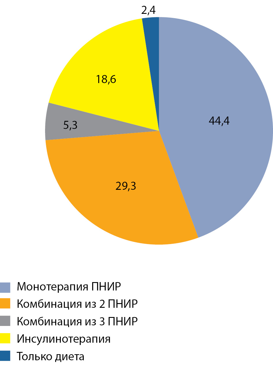 ПНИР получали 79,1%, а комбинацию ПНИР в сочетании с инсулином — 11,4% всех пациентов с СД2.