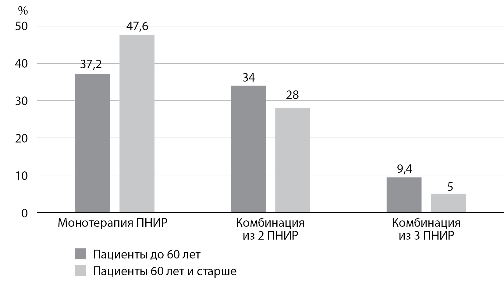 По данным регистра СД МО, 79% пациентов с СД2 относились к группе 60 лет и старше. Большинство из них находились на монотерапии препаратами неинсулинового ряда (47,6%, 89 856 чел.), в то время как среди пациентов до 60 лет монотерапия использовалась реже (37,2%, 18 213 чел.). Комбинацию двух ПНИР получали 28% (52 906 чел.) среди лиц 60 лет и старше и 34% (16 766 чел.) до 60 лет, а комбинацию трех ПНИР — 5% (9402 чел.) и 9,4% (4584 чел.) соответственно (рис. 2).