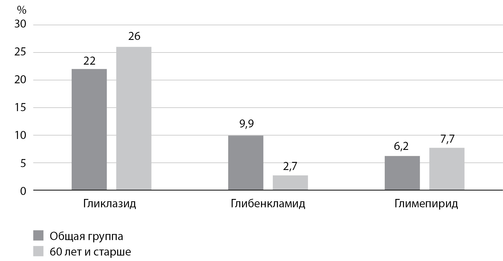 Среди всех пациентов с СД2 60 лет и старше 2,7% все еще получают терапию глибенкламидом. В то же время лечение гликлазидом получают четверть (26%) пациентов старшей возрастной группы, что существенно превосходит применение глибенкламида.
