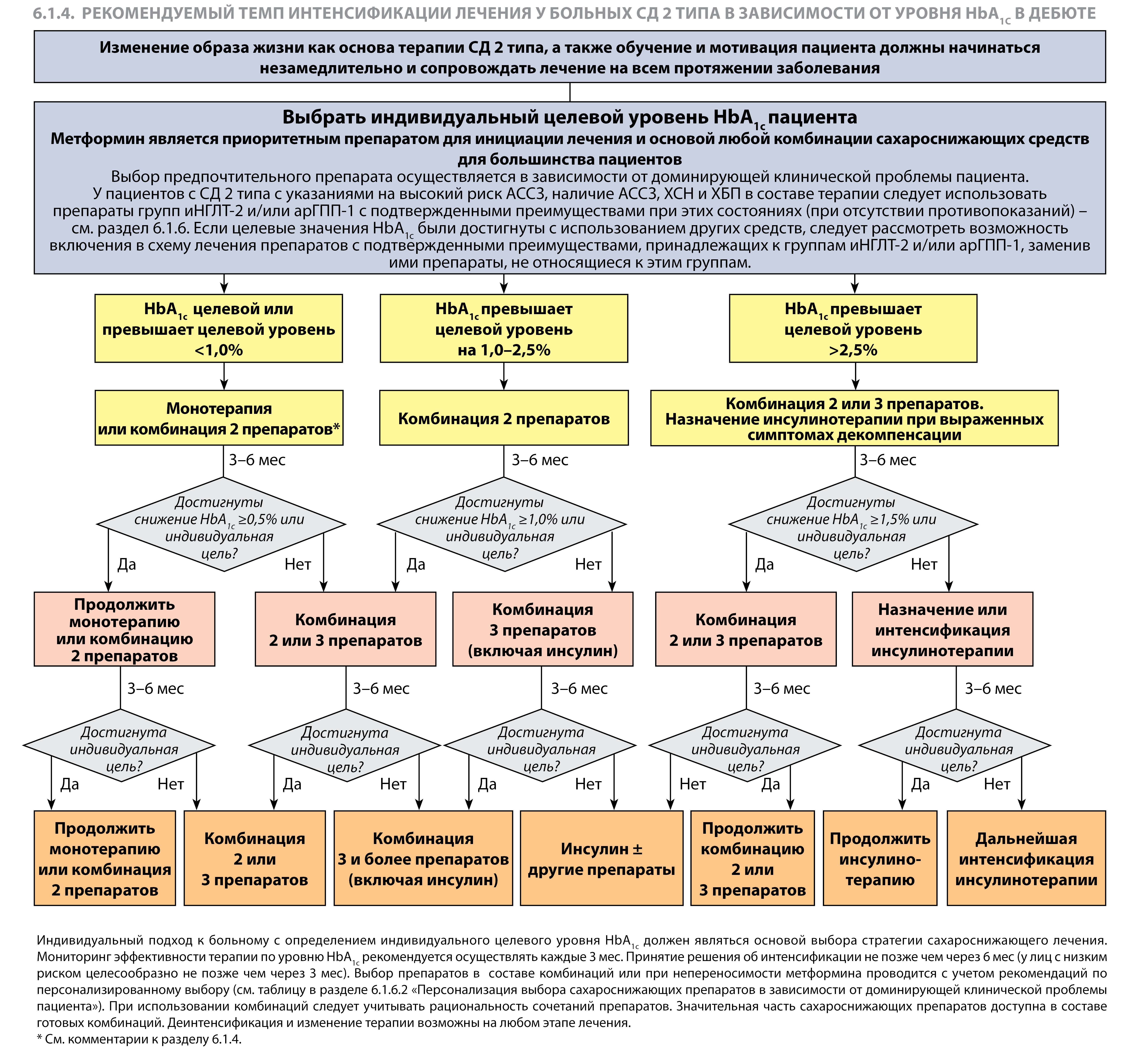 1. 6.1.4. Рекомендуемый темп интенсификации лечения у больных СД 2 типа в зависимости от уровня HbA1c в дебюте