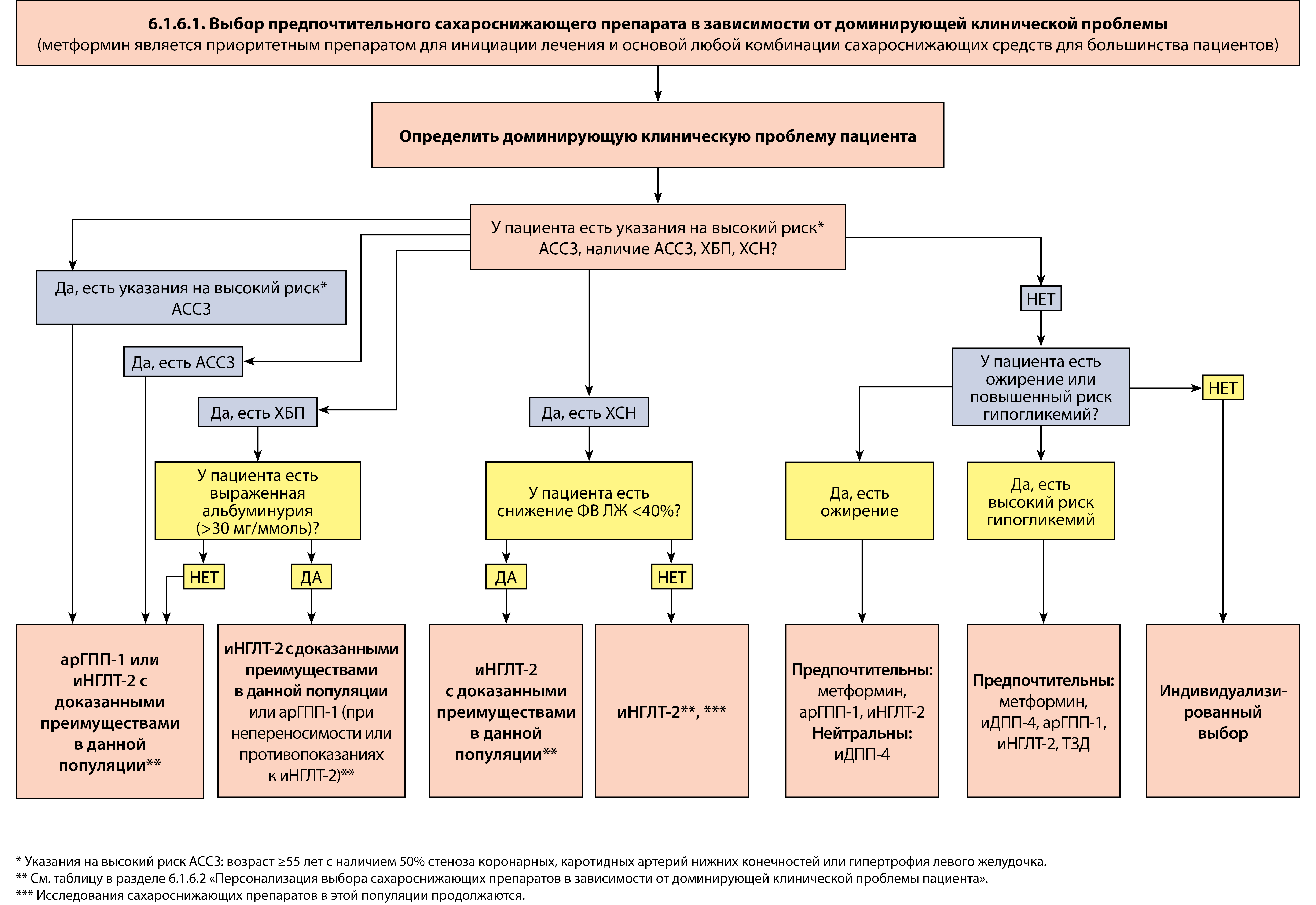 • В рекомендациях по персонализации выбора сахароснижающих препаратов учтено, что в определенных клинических ситуациях (наличие атеросклеротических сердечно-сосудистых заболеваний и их факторов риска, хронической сердечной недостаточности, хронической болезни почек, ожирения, риск гипогликемий) определенные классы сахароснижающих средств (или отдельные препараты) имеют доказанные преимущества.
