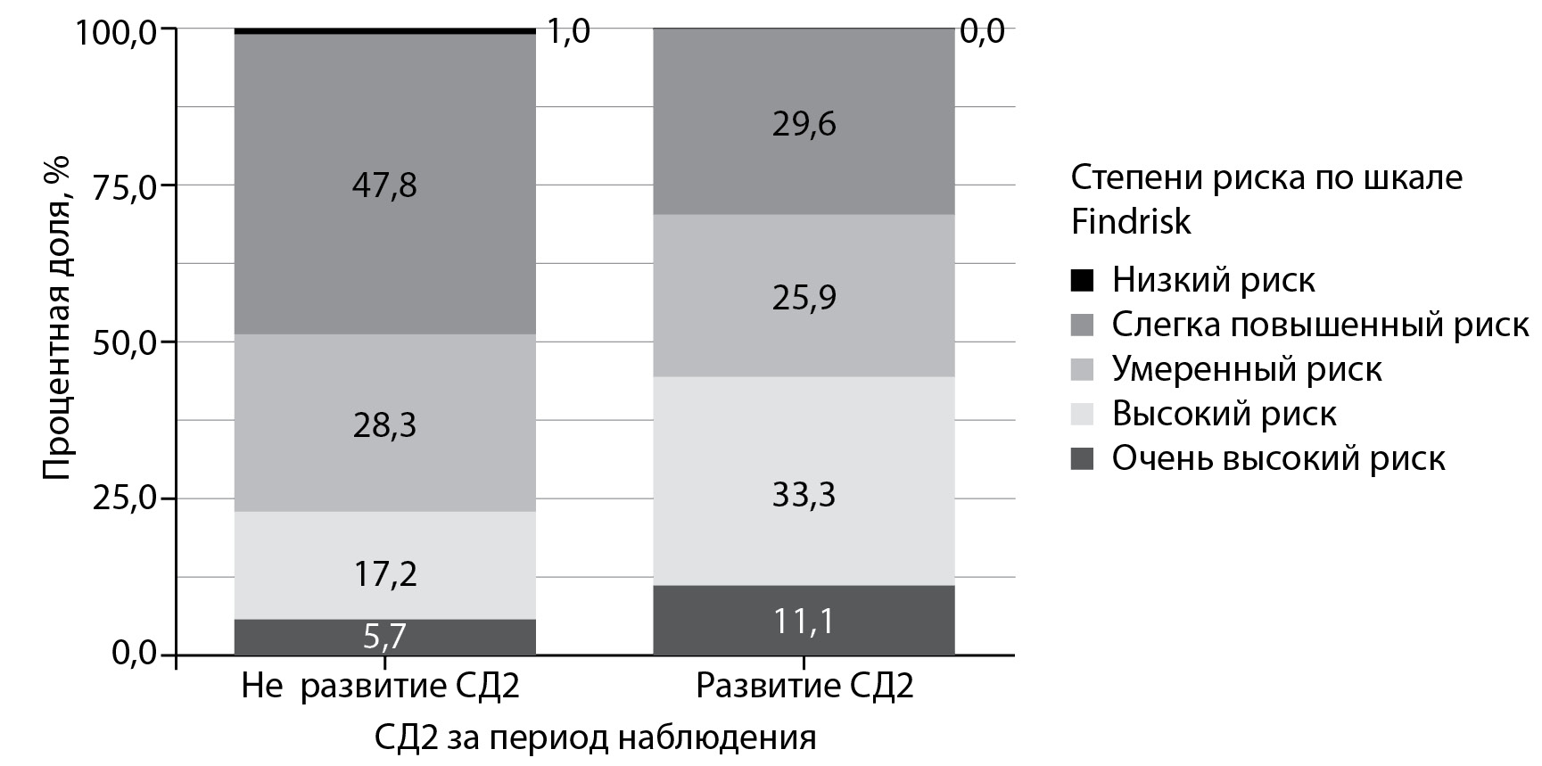 2. Рисунок 2. Сравнение результатов стратификации риска развития сахарного диабета 2 типа по шкале FINDRISС. | |
