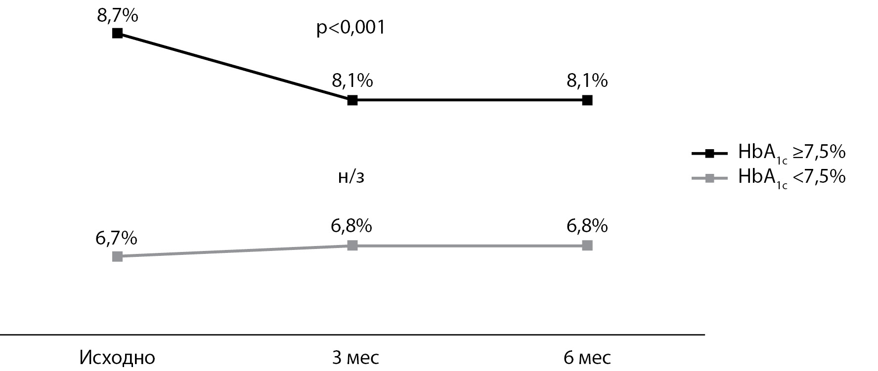 Рисунок 1. Изменение уровня гликированного гемоглобина в зависимости от исходного уровня: <7,5% (n=105), ≥7,5%(n=123).