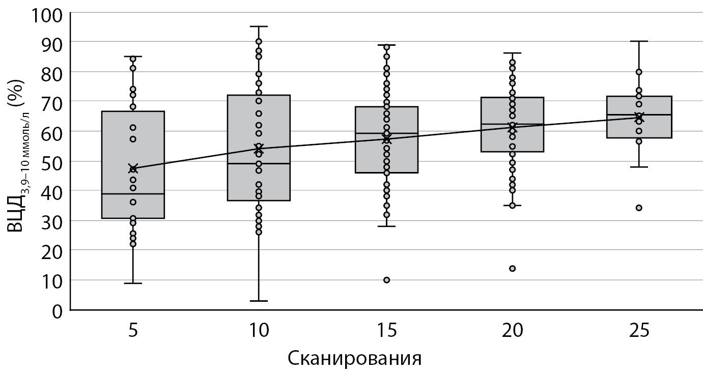 Во время исследования пациенты сканировали датчик от 5 до 35 раз в течение дня, что в среднем составило 14,9 раза в сутки. Большая частота сканирования была связана с более низкими показателями HbA1c, а также большим временем в целевом диапазоне 3,9–10,0 ммоль/л, при этом такая закономерность сохранялась при частоте сканирований более 15 раз в сутки (рис. 2, 3).