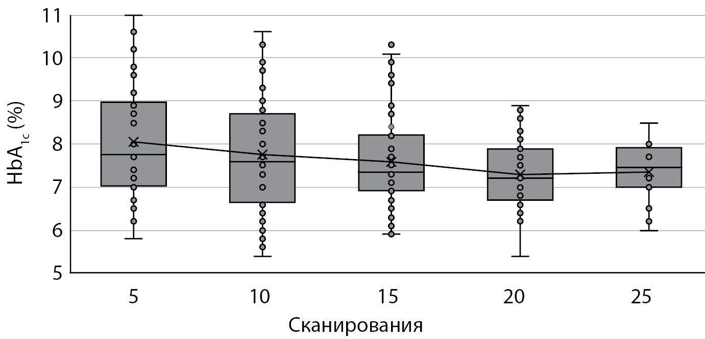 В исследовании J. Suzuki и соавт. [11] у 85 детей с СД1 была выявлена положительная корреляция частоты сканирований с продолжительностью времени в целевом диапазоне (r=0,719; P<0,0001) и обратная корреляция с временем выше диапазона (r=-0,743; P<0,0001), средним уровнем глюкозы и уровнем HbA1c и расчетным значением HbA1c (r=-0,765, -0,815, -0,793 соответственно, p<0,0001).