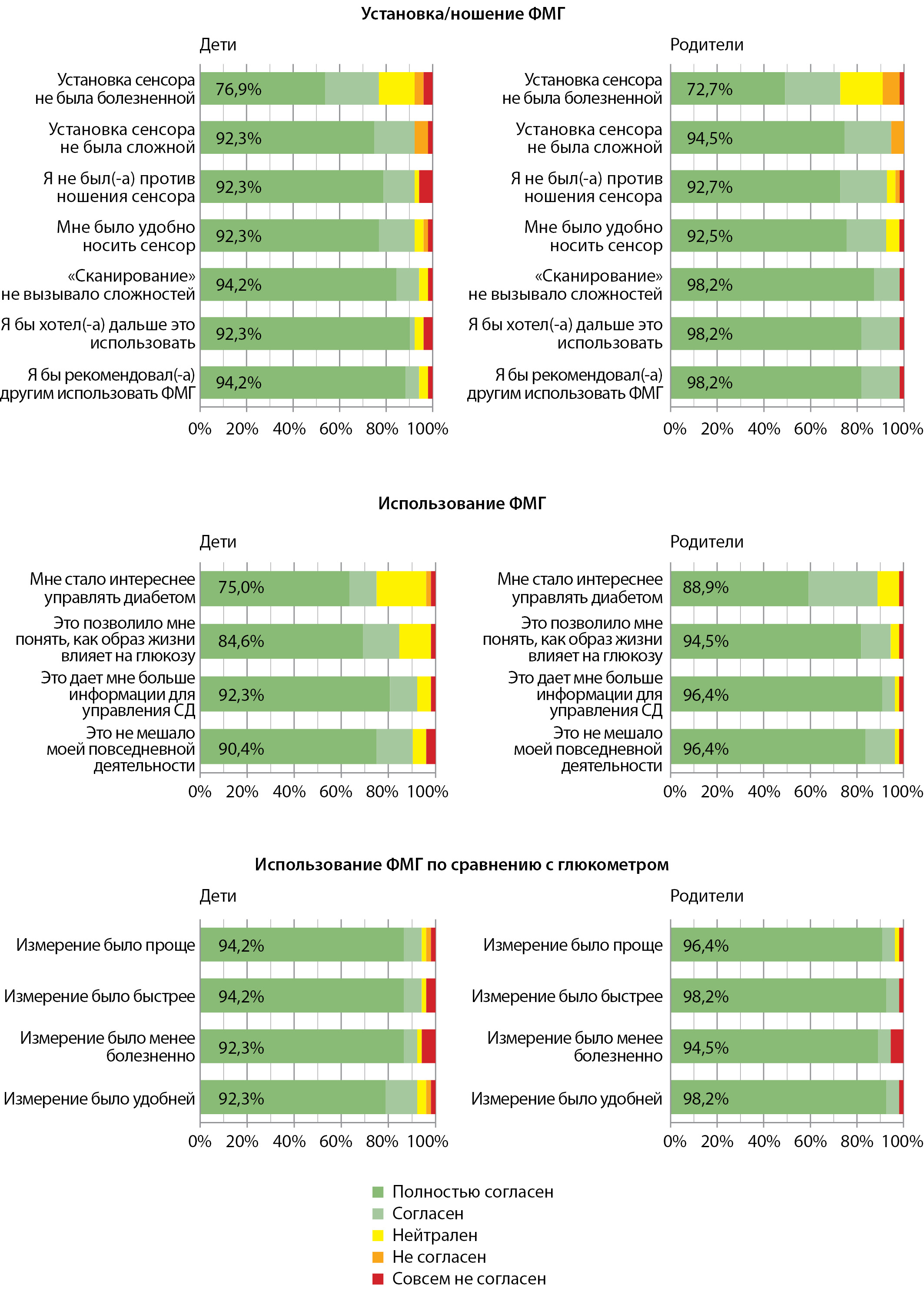 Рисунок 4. Принятие и удовлетворенность флеш-мониторинга глюкозы детьми и родителями. ФМГ — флеш-мониторирование глюкозы