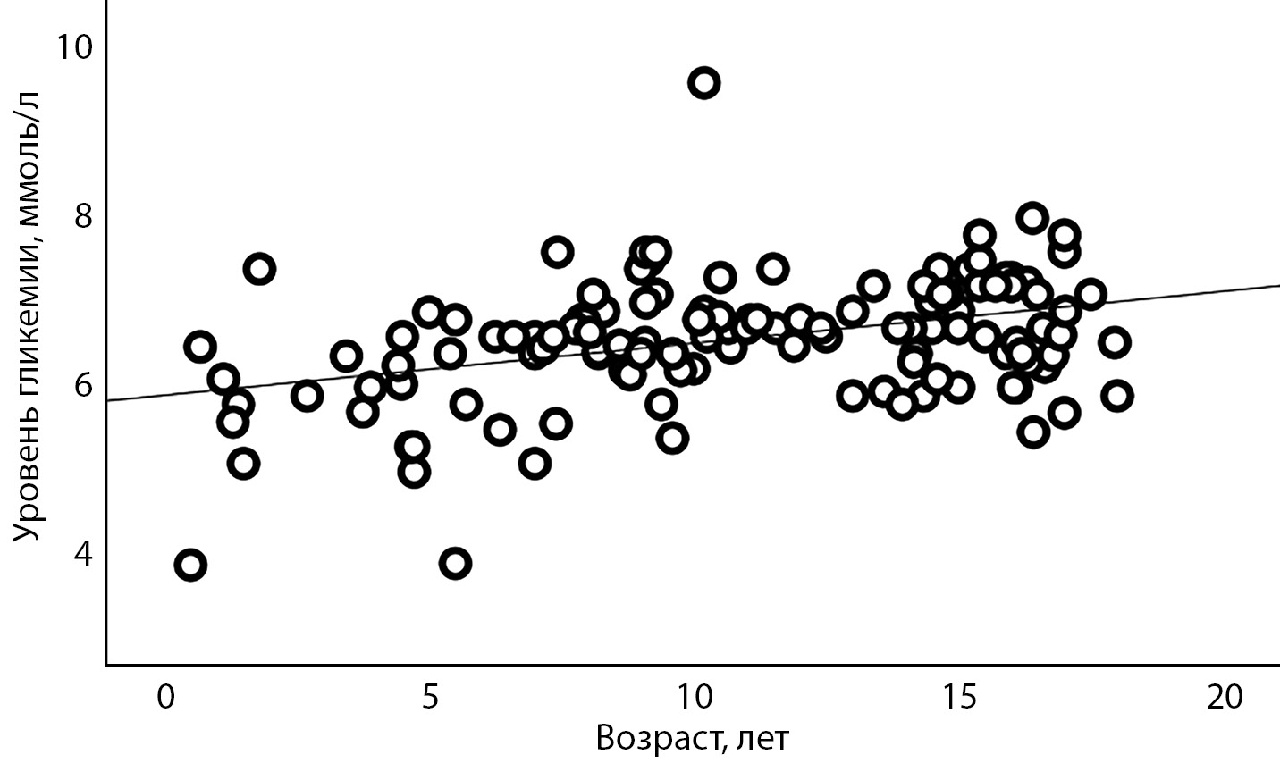 1. Рисунок 1. Корреляционная взаимосвязь между возрастом обследования и уровнем гликемии натощак у детей с GCK-MODY.