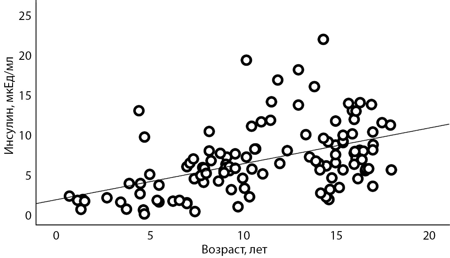 Уровень С-пептида натощак составил 1,5 нг/мл [ 1,0; 1,9], на 60-й минуте — 5,3 нг/мл [ 4,1; 7,1], на 120-й минуте — 4,9 нг/мл [ 3,7; 6,7]. Уровень инсулина натощак 6,2 мкЕд/мл [ 3,6; 9,0], на 60-й минуте — 38,2 мкЕд/мл [ 23,1; 54,1], на 120-й минуте — 30,2 мкЕд/мл [ 17,0; 48,2]. Выявлена умеренная положительная корреляция между возрастом обследования и уровнями С-пептида (r=0,656; p<0,001) (рис. 2) и инсулина (r=0,531; p<0,001) (рис. 3).