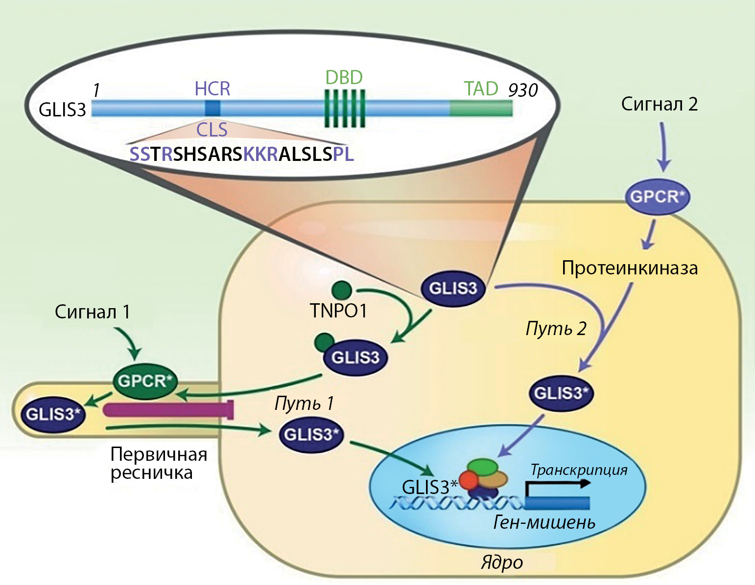 ДНК-связывающий домен (DBD) состоит из 5 регионов С2Н2 участков «цинковых пальцев», трансактивирующего домена (ТАD) и высококонсервативной области (HCR). HCR состоит из ресничко-локализованных сигналов (CLS), которые взаимодействуют с TNPO1 испособствуют входу GLIS3 в первичную ресничку. Транскрипционная активность GLIS3 регулируется множественными путями, включающими зависимый от первичной реснички и независимый пути (пути 1 и 2 соответственно), через активацию различных рецепторов G белка (GPCRs) при помощи соответствующих входящих сигналов и участие протеинкиназ.