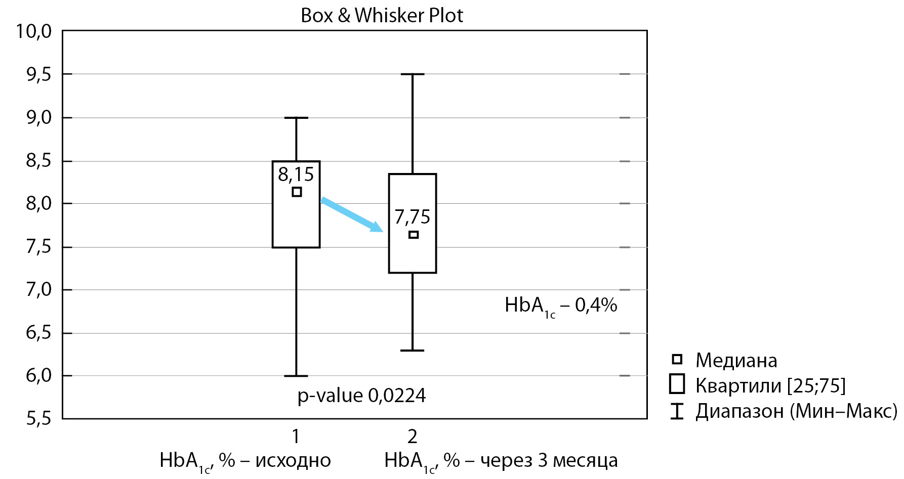 2. Рисунок 2. Динамика уровня гликированного гемоглобина после перевода с инсулина аспарт на сверхбыстродействующий инсулин аспарт (12 недель).