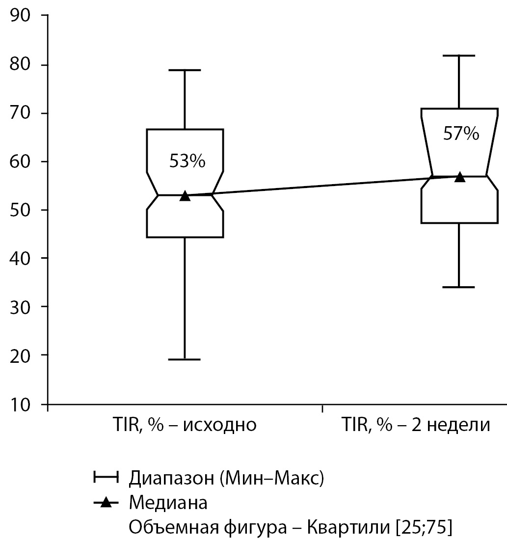 РЕЗУЛЬТАТЫ. Через 2 нед после перевода с иАсп на БДиАсп во всех группах пациентов увеличилось время нахождения в целевом диапазоне уровня глюкозы (TIR) с 53% [44,3; 66,5] до 57% [47,4; 71,0] (p-value=0,010) и уменьшился показатель времени нахождения выше целевого диапазона (TАR) с 38% [24,8; 50,2] до 30,5% [22,0; 45,0] (p-value=0,0124) при статистически недостоверном уменьшении показателя времени нахождения ниже целевого диапазона (TBR). Те же тенденции продолжили сохраняться и в показателях через 12 нед, хотя и не достигнув статистической значимости при достоверном уменьшении эпизодов гипогликемии <3,9 ммоль/л в неделю, что привело к улучшению контроля СД1: снижению HbA1c с 8,15 до 7,75% (p-value = 0,0224), более выраженному в группе пациентов на ППИИ — с 7,9 до 7,5% (p-value=0,028).