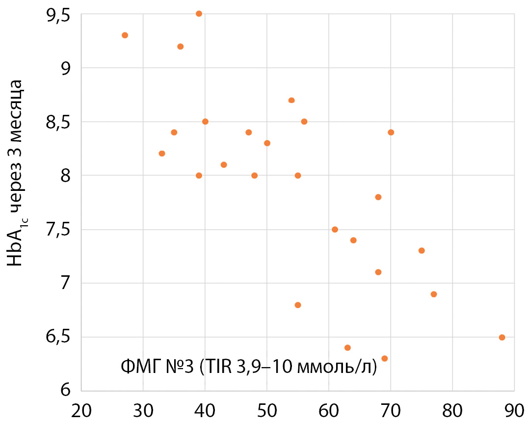 4. Рисунок 4. Обратная корреляция параметров гликированного гемоглобина и времени нахождения в целевом диапазоне после перевода с инсулина аспарт на сверхбыстродействующий инсулин аспарт (12 недель).