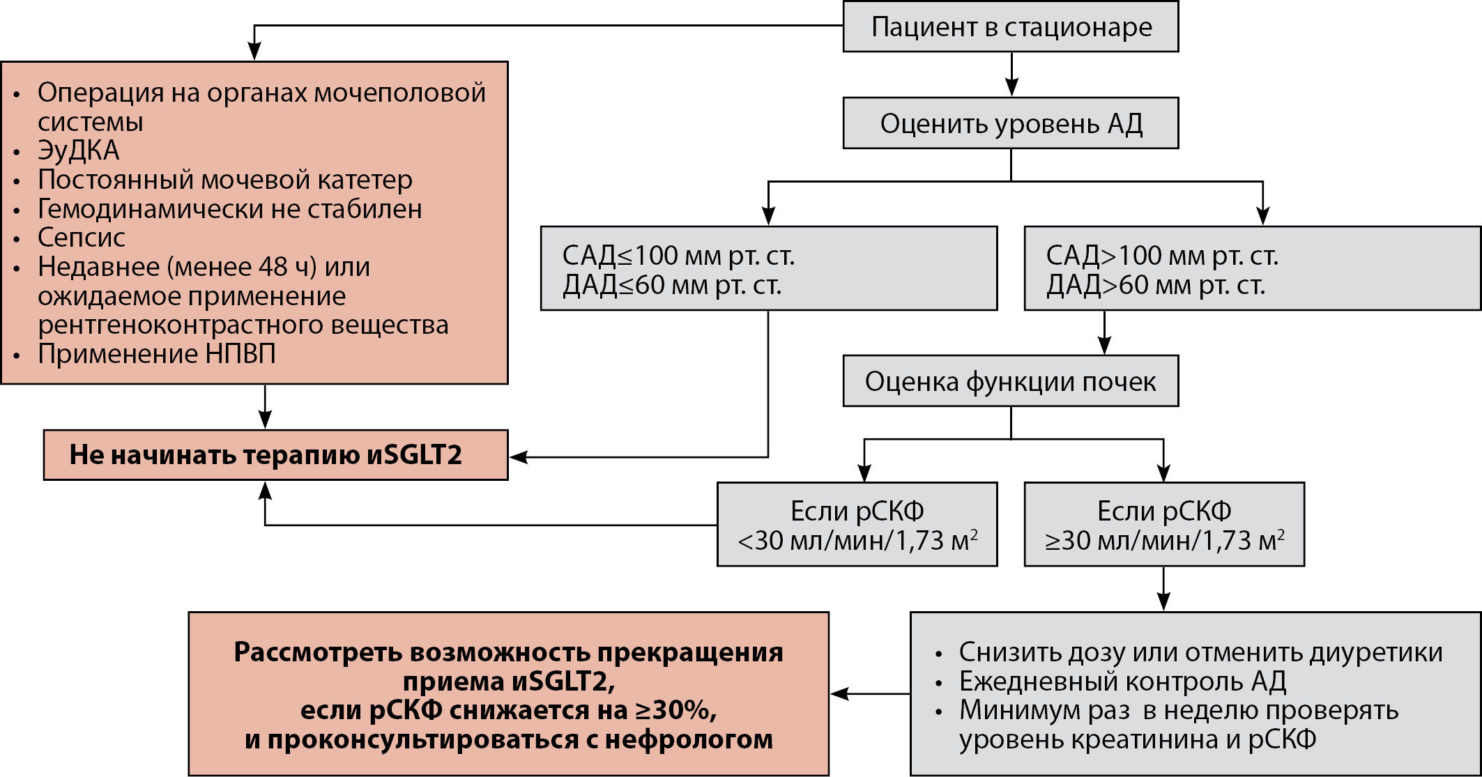 До начала инициации терапии иSGLT2 у стационарного пациента, недавно перенесшего сердечно-сосудистое событие, необходимо удостовериться, что состояние пациента является стабильным и соответствует основным критическим критериям, затрагивающим гемодинамический статус пациента, оценку функции почек с обязательным определением рСКФ, наличие жизнеугрожающих состояний и перспективу проведения определенных медицинских вмешательств (рис. 3).