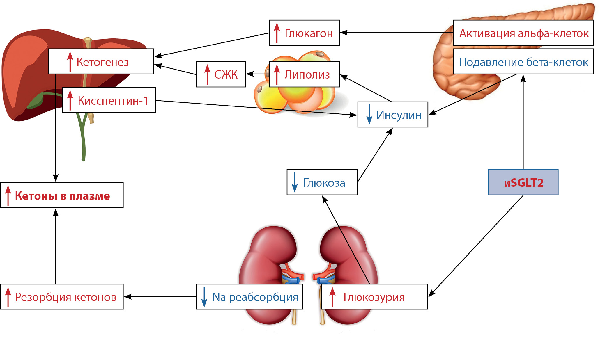 1. Рисунок 1. Механизмы, лежащие в основе диабетического эугликемического кетоацидоза на фоне приема ингибиторов натрий-глюкозного котранспортера 2 типа. Адаптировано из [29]. Примечание. СЖК - свободные жирные кислоты. иSGLT2 - ингибиторы натрий-глюкозного котранспортера 2 типа