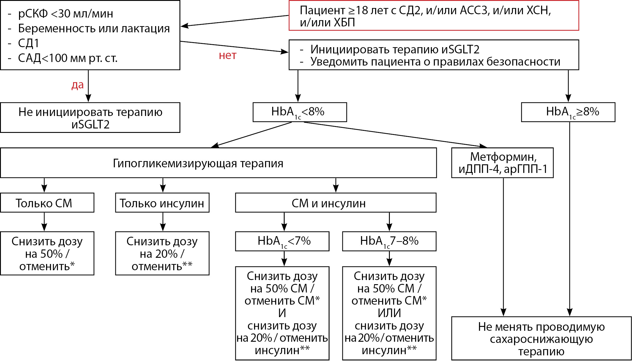 2. Рисунок 2. Алгоритм коррекции сахароснижающей терапии при назначении ингибитора натрий-глюкозного котранспортера 2 типа. Адаптировано из [43].