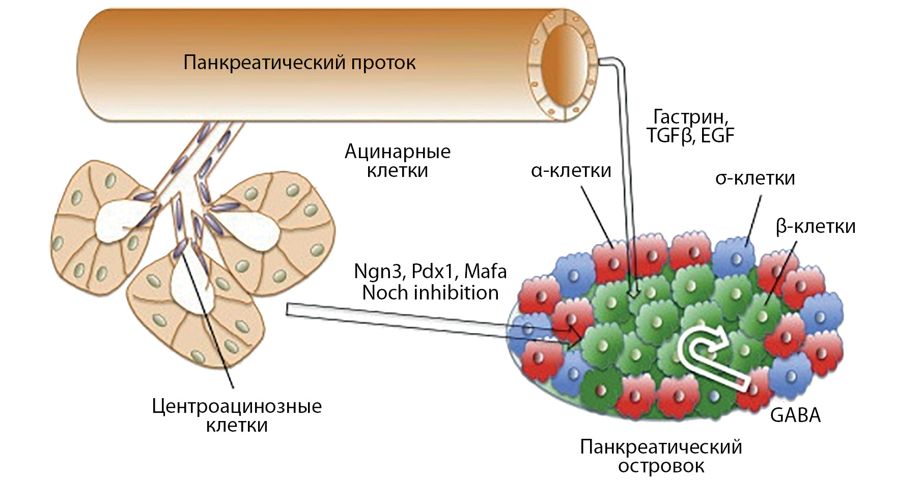 Примечания: Ngn3 — neurogenin-3 (нейрогенин-3); Pdx1 — Pancreas/duodenum homeobox protein 1 (панкреатический и дуоденальный гомеобокс 1); Mafa — V-maf musculoaponeurotic fibrosarcoma oncogene homolog A (гомолог А онкогена v-maf мышечно-апоневротической фибросаркомы); EGF — epidermal growth factor (эпидермальный фактор роста); TGF-β — transforming growth factor-β (Трансформирующий фактор роста бета); GABA - γ-aminobutiryc acid (гамма-аминомасляная кислота)