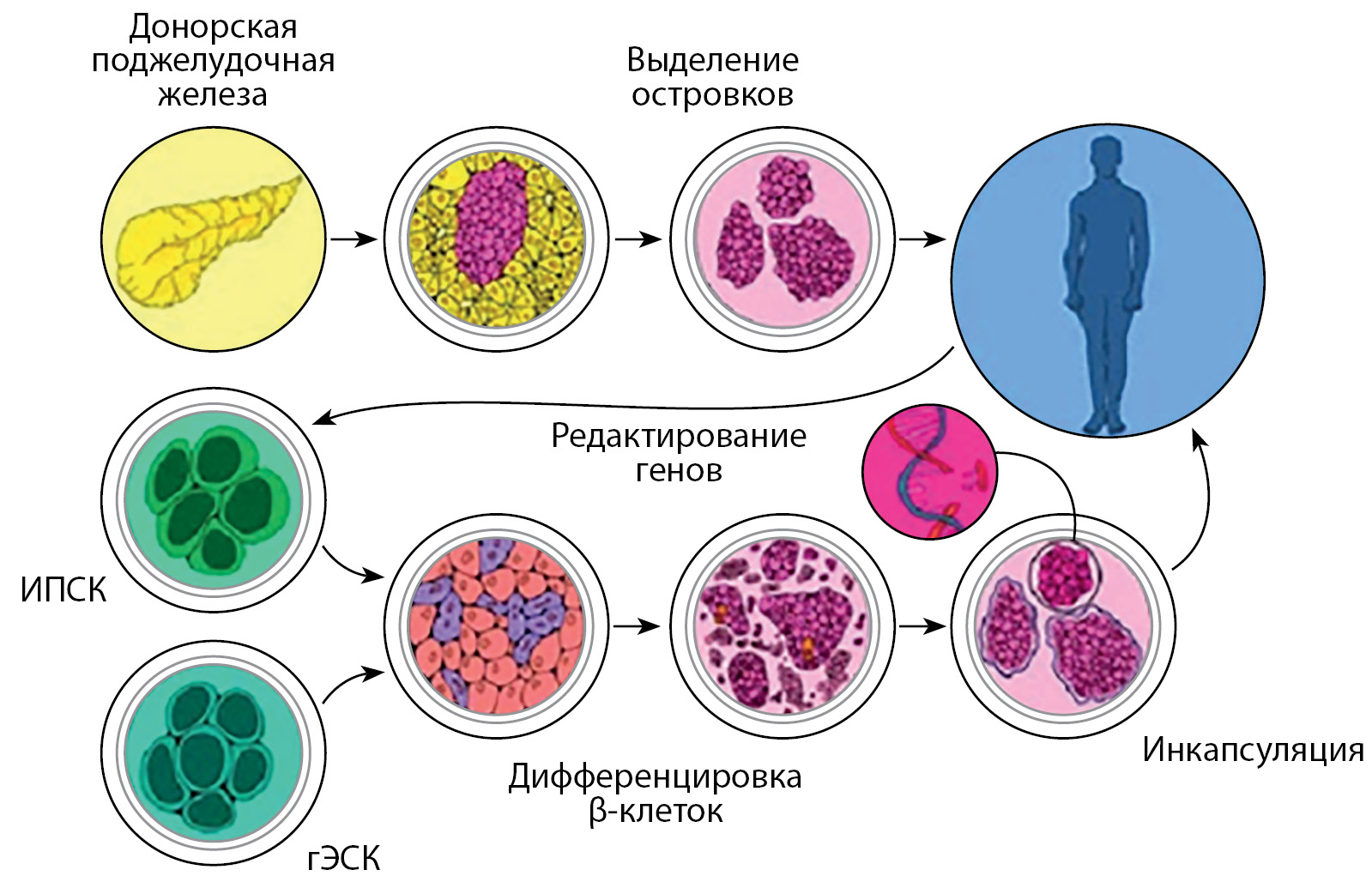 Кроме того, исследования последних лет привели к разработке более совершенных протоколов для создания экзогенных человеческих β-клеток из стволовых клеток и к разработке новых подходов для обеспечения их выживания и иммунной защиты при трансплантации.