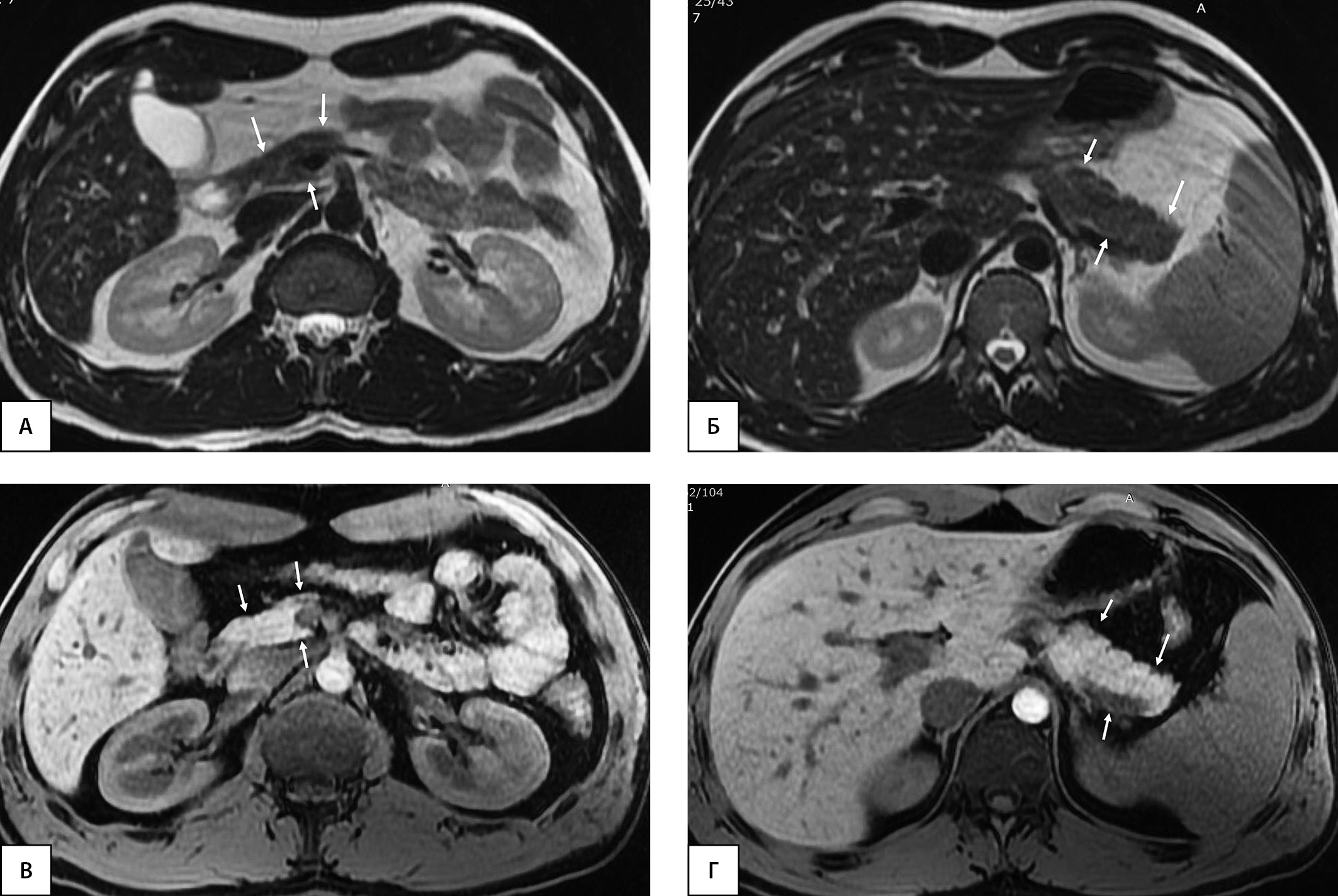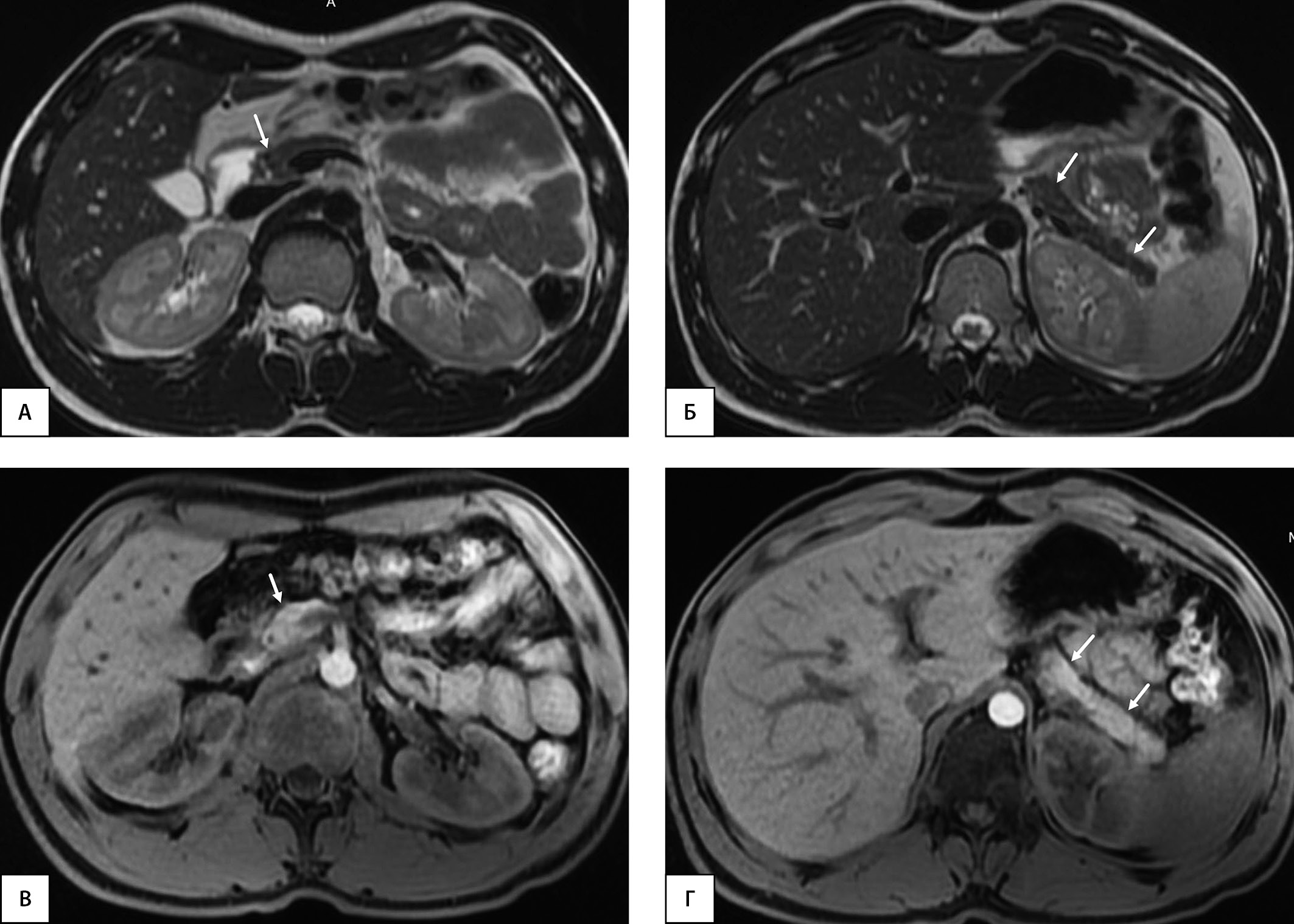 Рисунок 3. Пациент, 24 года (длительность СД1 4 года). МРТ органов брюшной полости на уровне головки поджелудочной железы (А, В) и на уровне тела и хвоста (Б, Г). А, Б — Т2-ВИ, аксиальная плоскость; В, Г — Т1-ВИ, аксиальная плоскость. Определяется диффузное снижение объема поджелудочной железы, больше изменения выражены на уровне головки (стрелки). ОПЖ=38,1 мл; ОПЖ/ИМТ=38,1/23,4=1,63 мл/(кг/м2); ОПЖ/ППТ=38,1/1,94=19,64 мл/м2.
