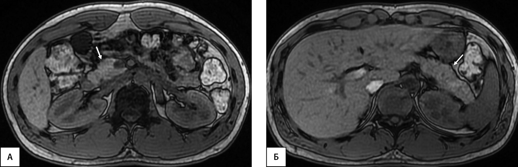 Рисунок 2. Здоровый доброволец из группы контроля, 25 лет, без нарушений углеводного обмена. МРТ органов брюшной полости на уровне головки поджелудочной железы (А) и на уровне тела и хвоста (Б) (поджелудочная железа показана стрелками). А и Б — Т1-ВИ, аксиальная плоскость. ОПЖ=57,3 мл; ОПЖ/ИМТ=57,3/24,3=2,36 мл/(кг/м2); ОПЖ/ППТ=57,3/1,98=28,93 мл/м2.