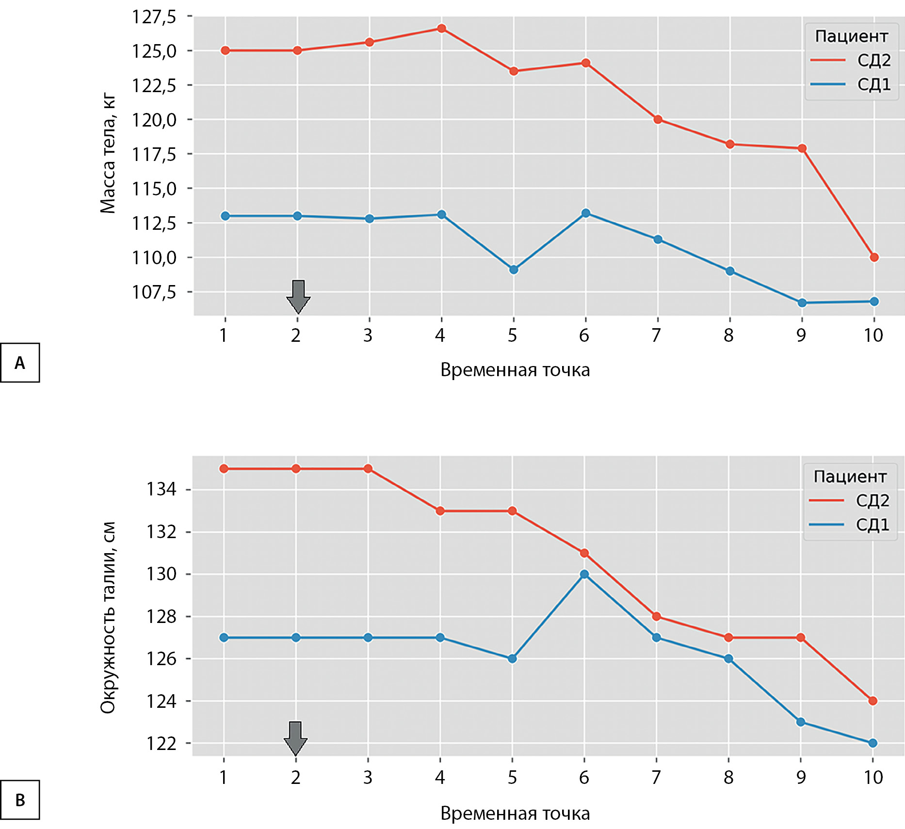 1. Рисунок 1. Динамика изменения антропометрических показателей у пациентов: А — динамика изменения массы тела; В — динамика изменения окружности талии. Cтрелкой на рисунке указана точка вмешательства. | |