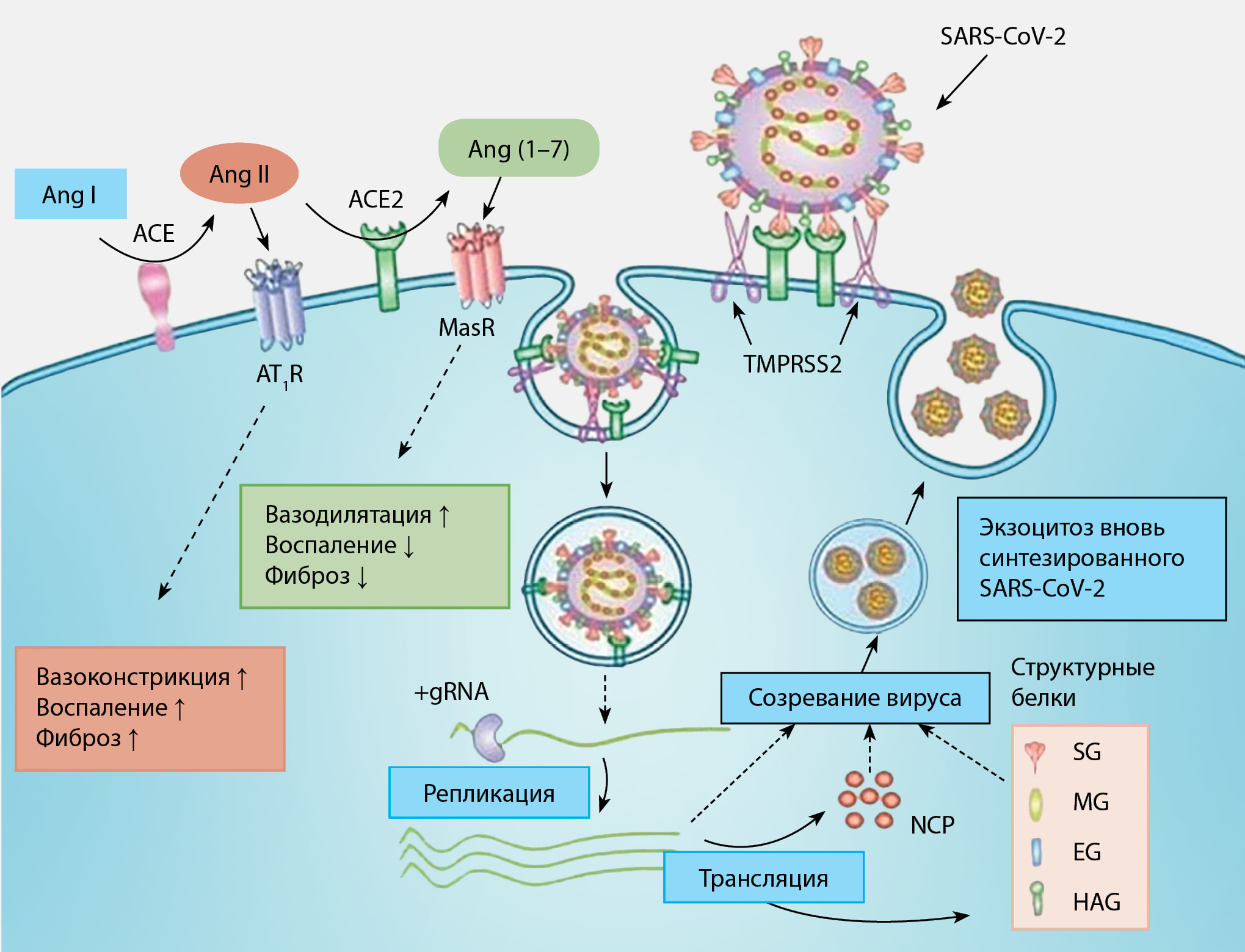 Ang — ангиотензин; Ang II — ангиотензин II; Ang (1–7) — ангиотензин (1–7); АСЕ — ангиотензинпревращающий фермент; АСЕ2 — ангиотензинпревращающий фермент 2; AT1R — рецептор ангиотензина 1-го типа; MasR — рецептор Mas; TMPRSS2 — трансмембранная сериновая протеаза; gRNA — геномная РНК; NCP — фосфопротеин нуклеокапсида; SG — спайковый гликопротеин; MG — мембранный гликопротеин; EG — гликопротеин оболочки; HAG — гликопротеин гемагглютинин-ацетилэстеразы.