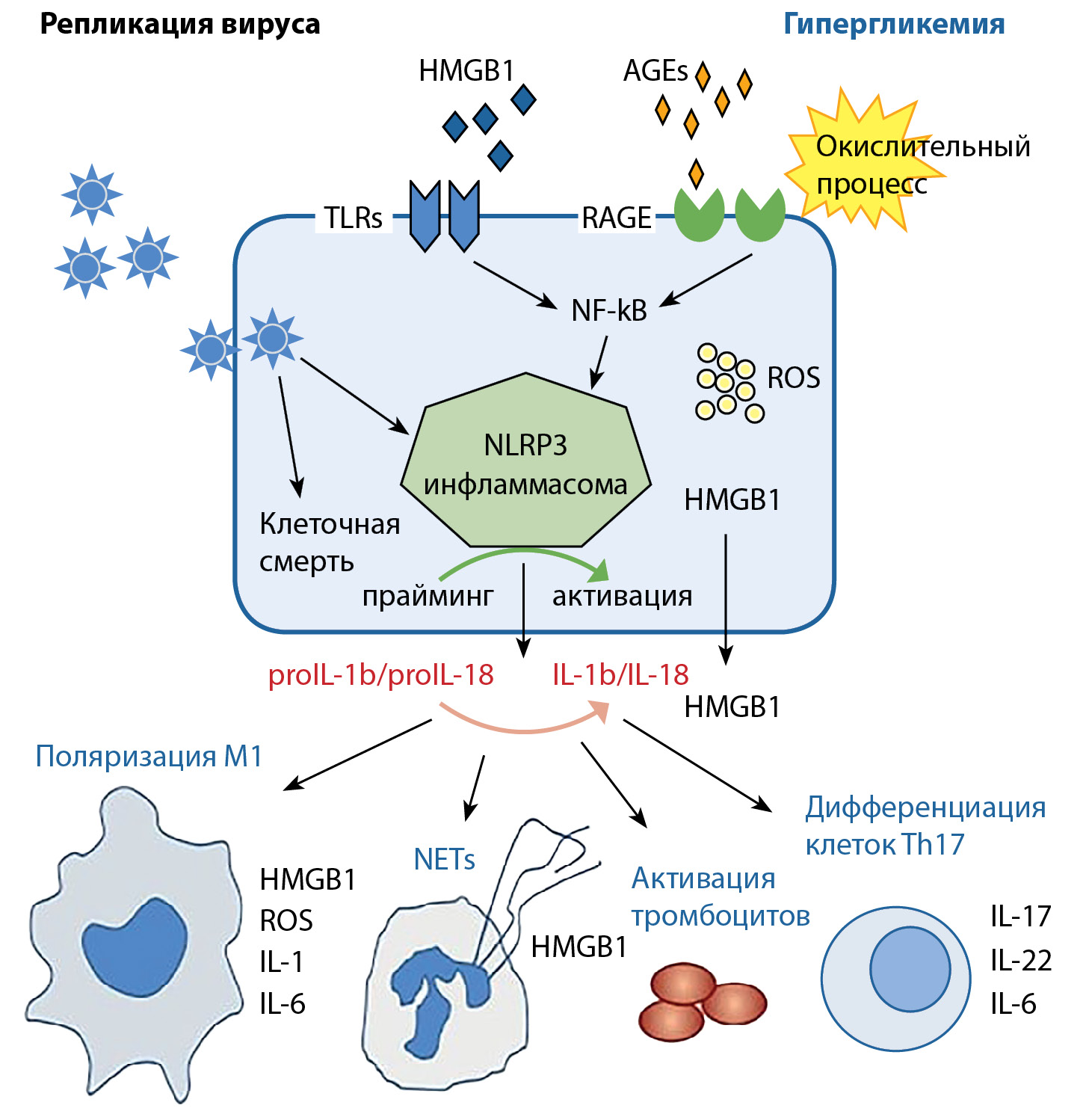 Гипергликемия увеличивает продукцию лигандов RAGE, что вызывает репликацию вируса и активацию сигналинга RAGE. В результате происходит запуск инфламмасомы, функция которой — обеспечить синтез цитокинов. Цитокины и пассивная секреция HMGB1 приводят к неконтролируемому иммунному ответу, открывая путь для цитокинового шторма.